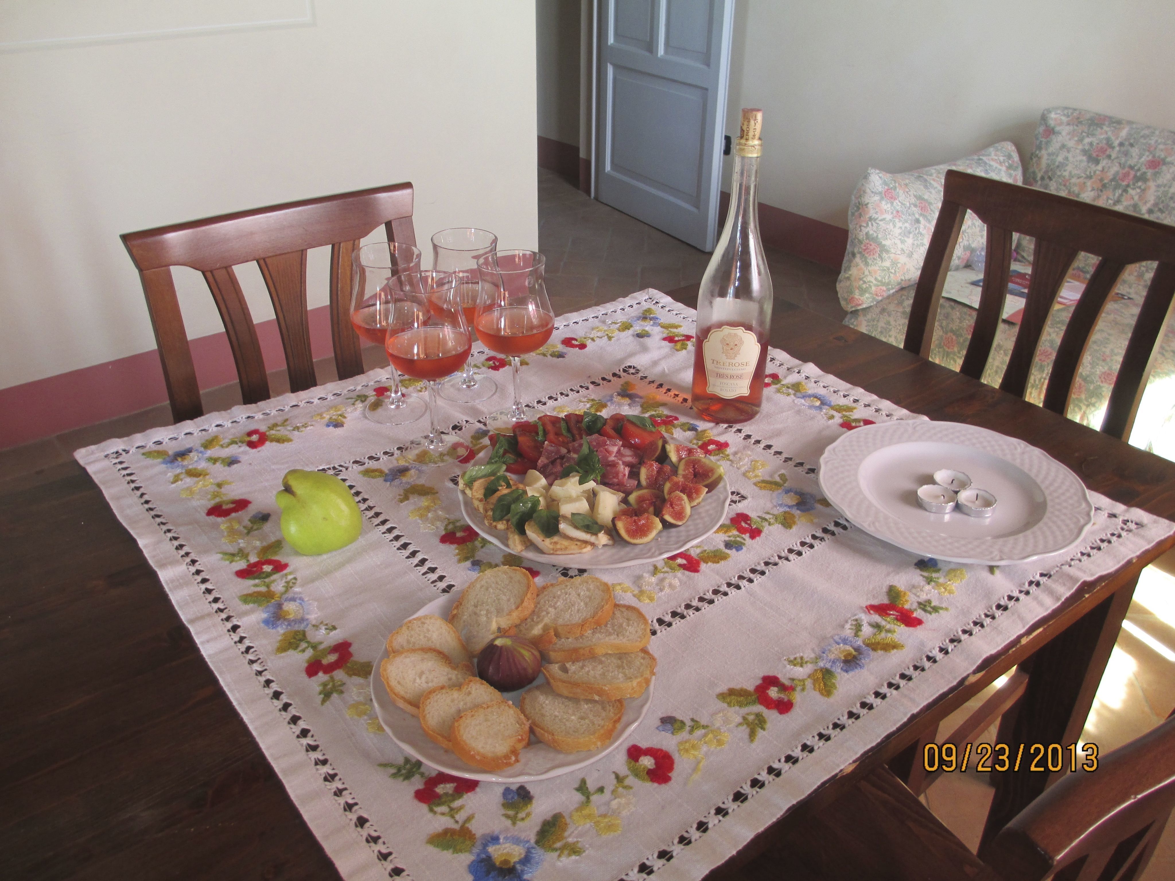Stopping occasionally to sample a ripe dew covered grape or two that pops in your mouth. Happening upon a colorful grouping of beehives down the road from Villa Casa al Bosco in Abbadia di Montepulciano where we were staying. Sweet honey being made at another vineyard called Il Greppo, where one can also buy and sample wines and rent bikes even if you're not staying in one of their lovely villa homes on the property. Stumbling upon fig and pear trees that were dropping their fruit on the ground, free for the taking if you beat the birds. Stopping to smell the fragrance of the over six foot high rosemary plants that seem to grow everywhere in Tuscany. Finding sweet white onions in the middle of the dirt roads as they bounced off the truck on the way to local markets. Later using these onions to sauté with the leftover juicy thick Florentine steak you and your three girlfriends on the trip had the night before up in Montepulciano. Accompanied by the strong freshly ground coffee that a restaurant owner in Montepulciano gave us the night before when hearing of our need for fresh coffee in the morning and having missed a small market open to purchase same on the drive down from Florence. A bountiful thrown together brunch finished off with a nice bottle of chilled dry Italian rose wine smelling of ripe strawberries. The wine had been recommended by Paolo at the wine bar and restaurant called La Bottega del Nobile in Montepulicano. Such a smart young man who puts 12 year old sweet thick aromatic balsamic vinegar on the table so you will sample and want to purchase some in his store above the restaurant before you leave.