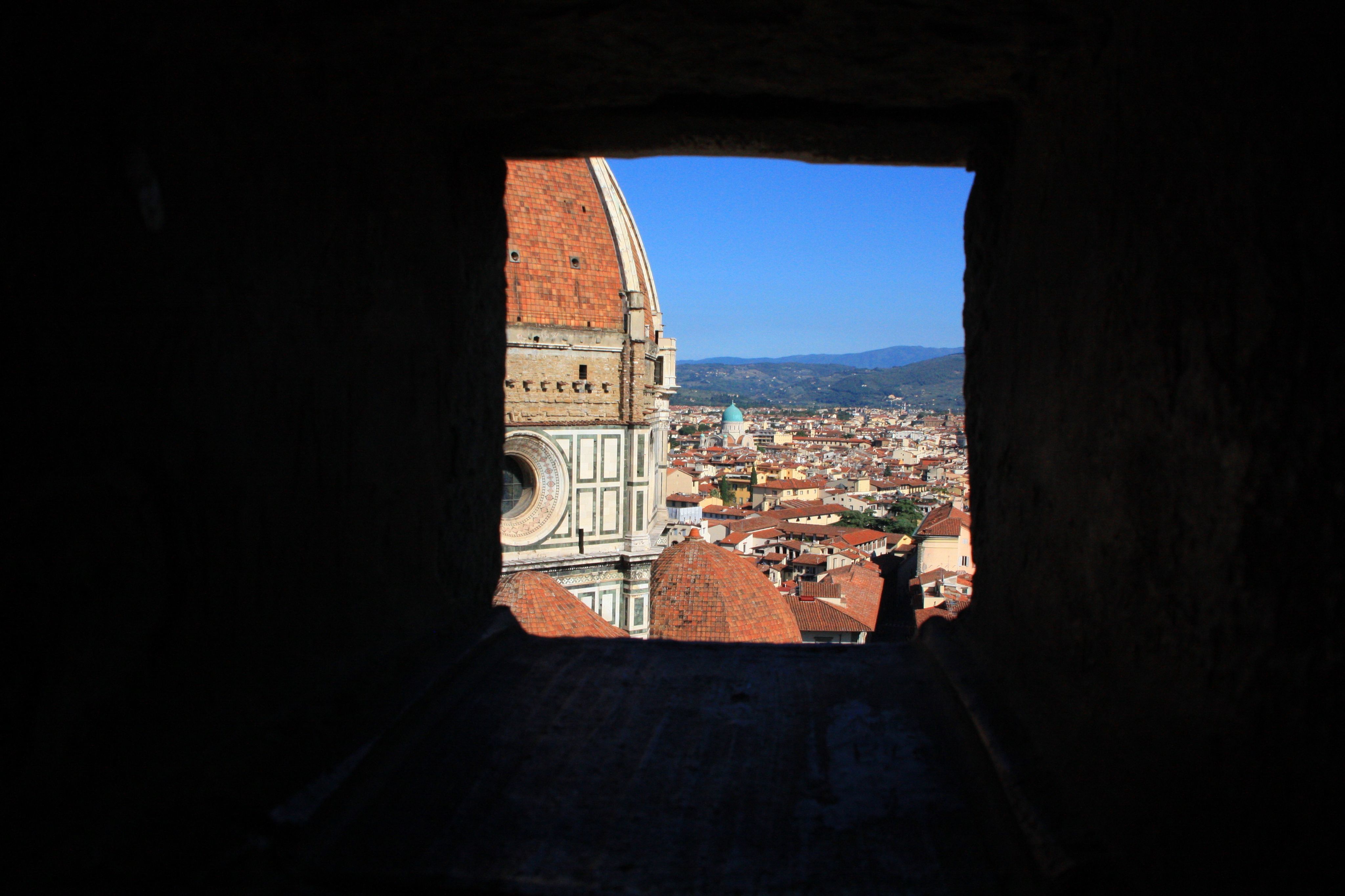 I climbed to the top of the Campanile (Giotto's Tower) to get a bird's eye view of "Brunelleschi's Dome", the dome atop the Duomo in Florence, Italy. The book of the same name (King) is a fascinating history of construction of this remarkable structure. This view from a portal in the tower.