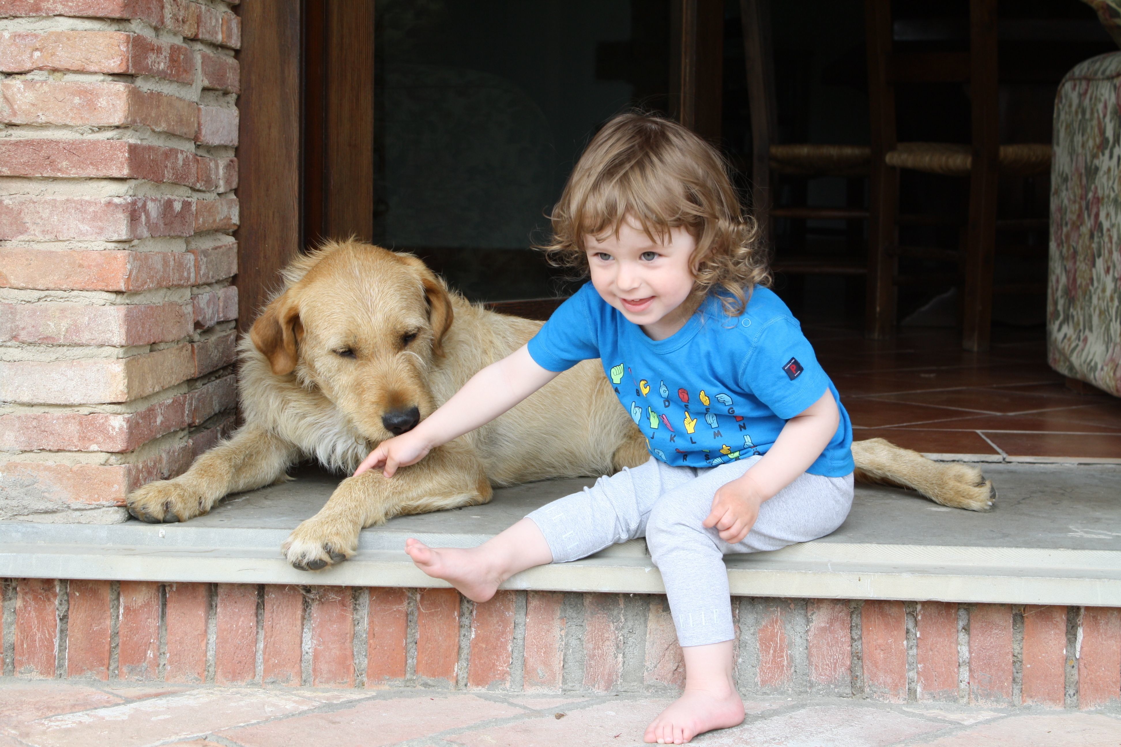 This photo was taken in our holiday in Tuscana summer 2010, in Sinalunga. We had together 8 families with children in the same big house. This dog was friendly to children, here is Elsa 2-years old with the dog.