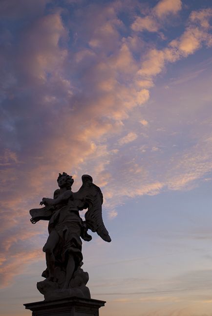 Statue shot again a sunset sky on the walking bridge over the Arno to the Castel Del Angelo in Rome.
