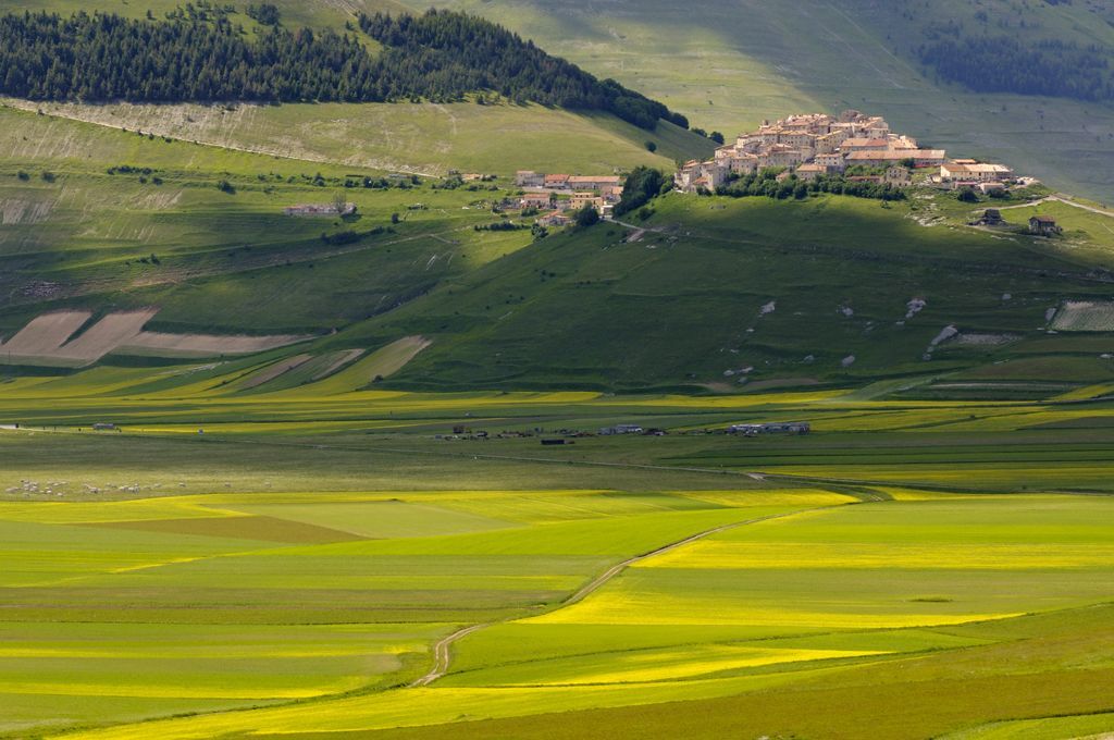 I primi di giugno la Piana si tinge di giallo per la fioritura delle lenticchie. Il sole fa capolino tra le nuvole, in un gioco di luci e ombre, sul borgo di Castelluccio e sull'omonima Piana.