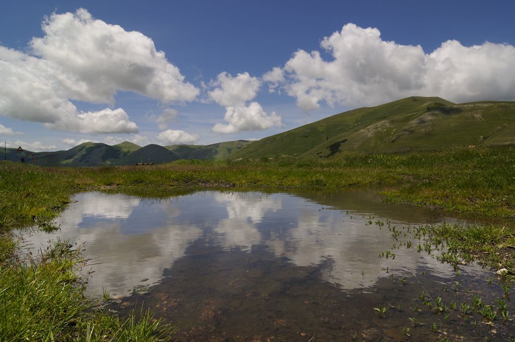 Castelluccio di Norcia (PG) Italia. Dopo un'acquazzone una piccola pozzanghera può trasformarsi in uno specchio per le nuvole. I monti Sibillini fanno da cornice alla Piana.