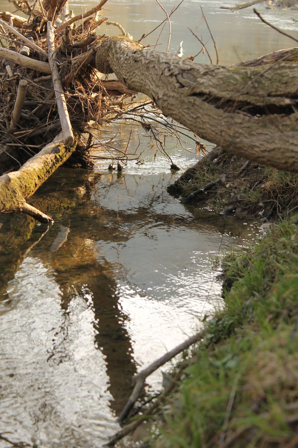 Due alberi caduti nel fiume con vari ramoscelli attaccati nel fiume Aniene. Nella foto si può vedere il riflesso degli alberi.