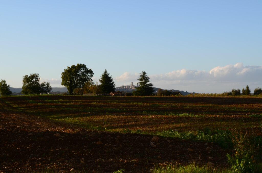 Campi e colli infiniti, e San Gimignano si scorge in lontananza.