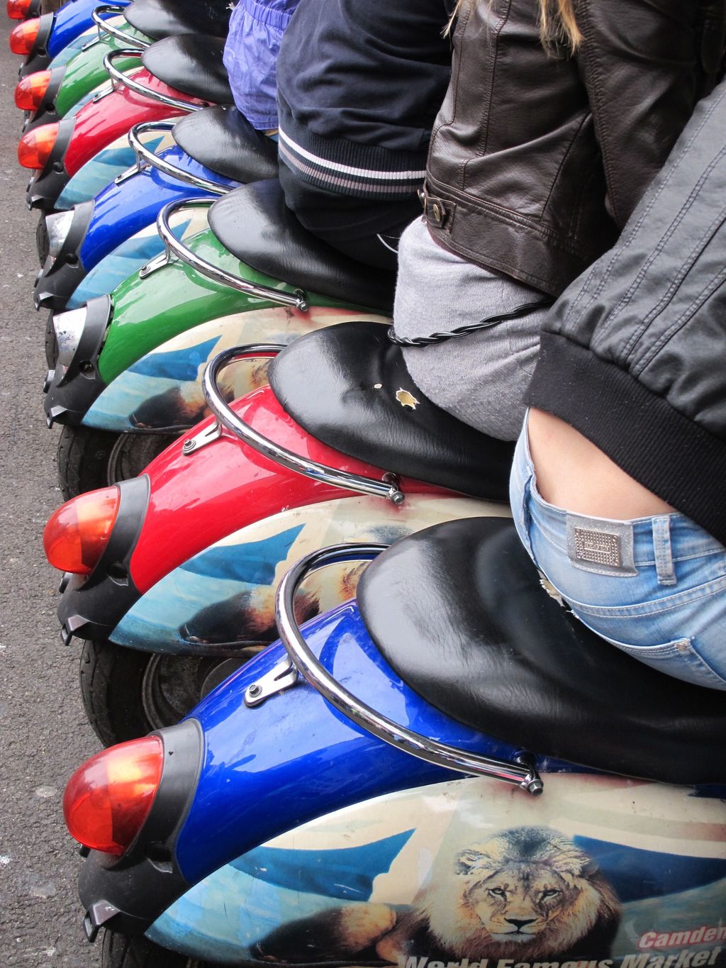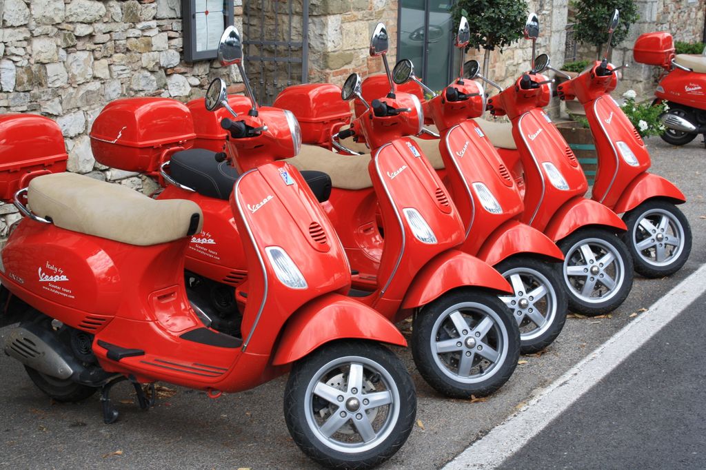A line of red scooters for hire in Radda in Chianti - reminded me of 60's Italian movie stars.. Taken just before a huge thunderstorm!