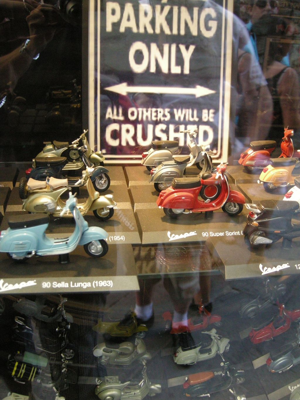 A Arezzo, moment magique, où entre antiquaires, et petits bistros, nous nous plongeons dans la ville où fut tourné le film "La vie est belle" de Begnini. Sur cette photo, le photographe est présent: reflété dans la vitrine et absorbé par les mythiques vespas.