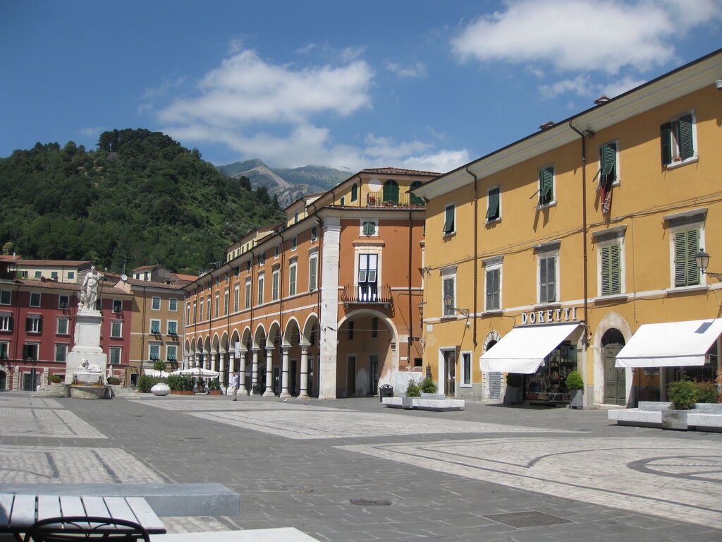 After driving and viewing the white marble quarries of Carrara we went into the city center. Tuscan Piazza. Typical architecture and style of the square. Completely empty of life - a sleeping piazza - as it was just before opening time after the lunch period. Wonderful.