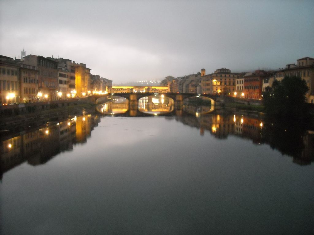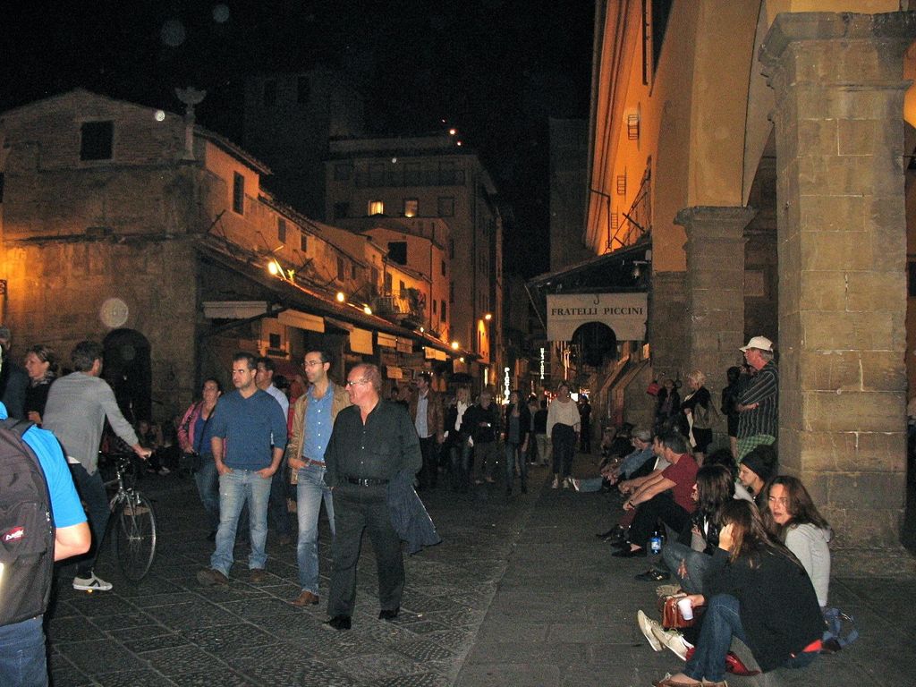 This shows pedestrians (locals and tourists) crossing the Pontevecchio at night.