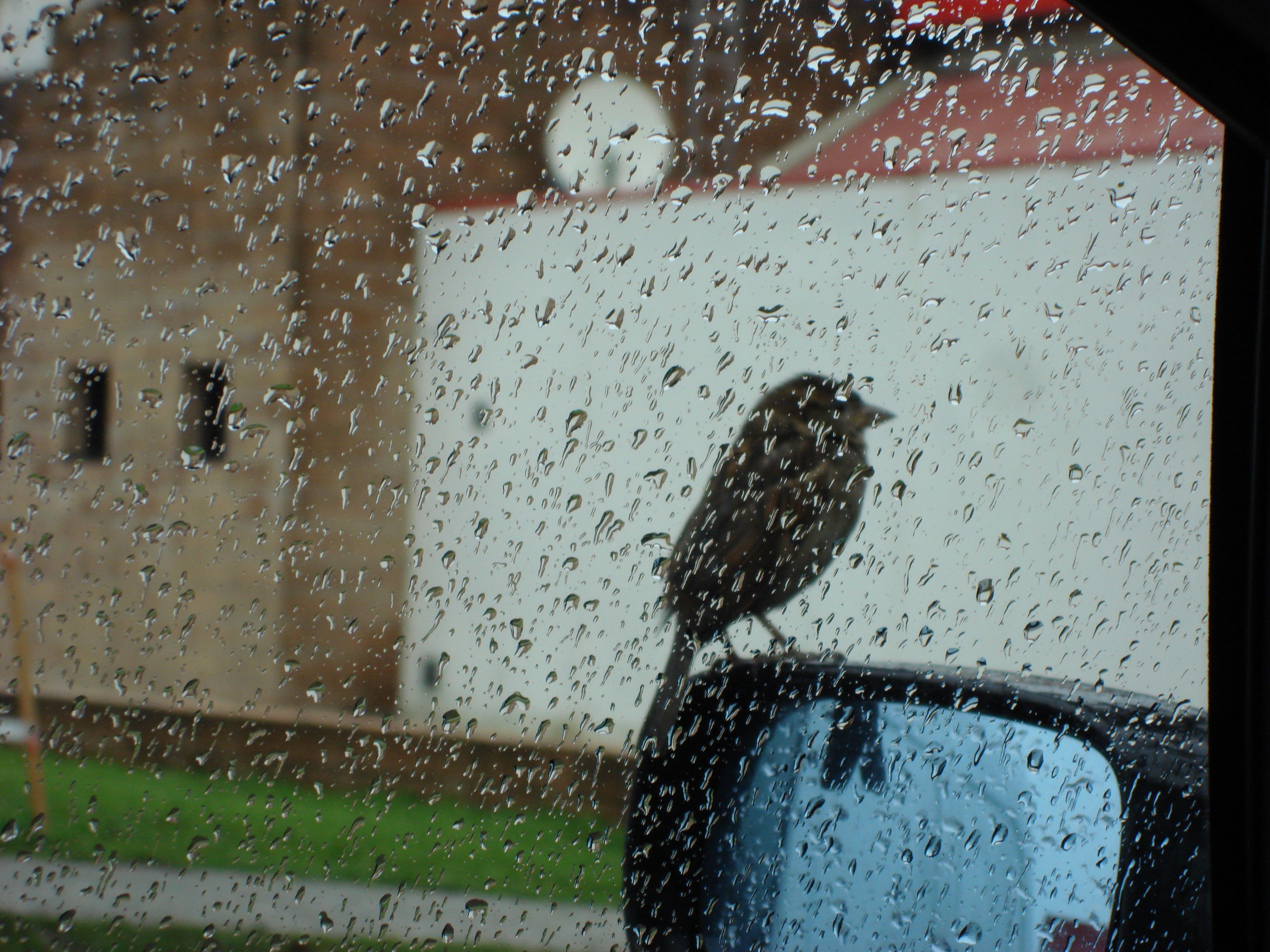 Sur une aire d'autoroute un petit oiseau se perche longuement sur le rétroviseur et se laisse photographier. Avec le zoom les bâtiments ingrats de la station prennent une allure moyenâgeuse.
