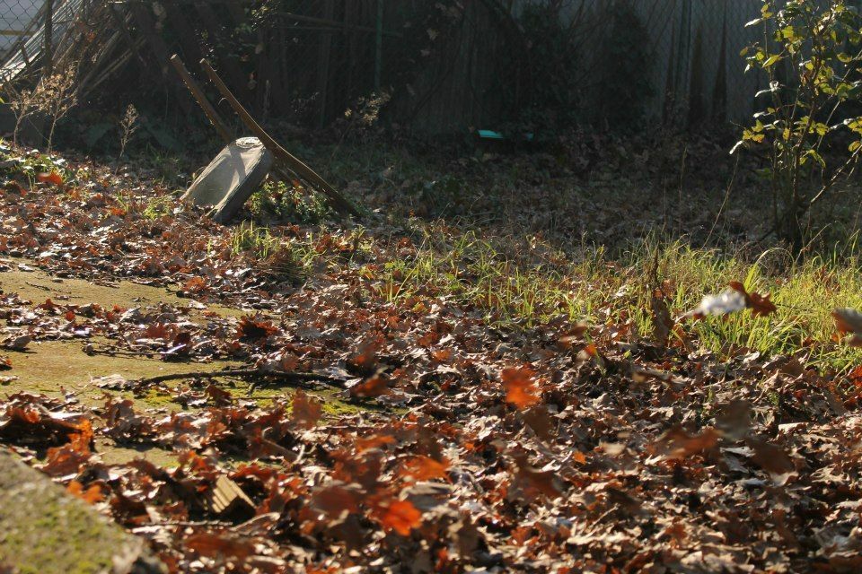 Una sedia rotta tra le foglie che si innalzano per via del vento che tirava.
