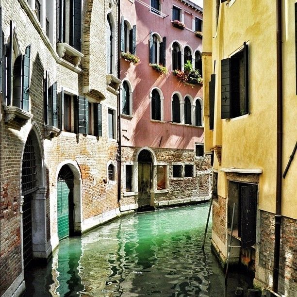 The late morning sun warms the flower adorned windows of this colorful Venetian canal.