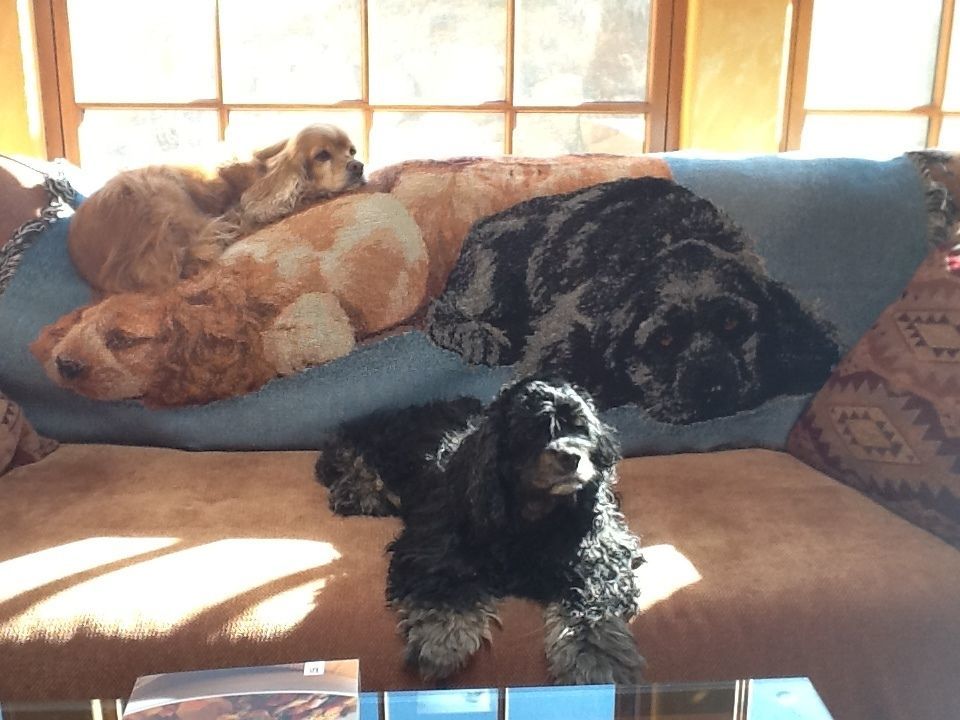 A red and black cocker sitiing in front of and on top of a woven tapestry of cocker spaniels of the same colors. Black cocker in front of the black cocker picture and a red cocker on top of the couch where the picture of a red cocker is.