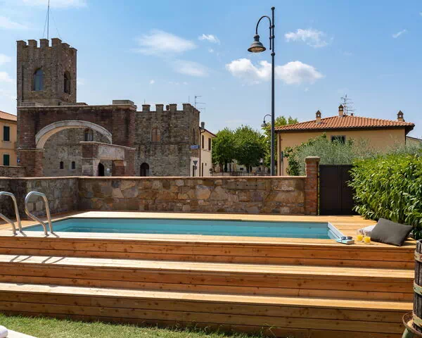 Vanaf de keuken is er een deur naar buiten. Een extra toilet is buiten te vinden, met douche en ruimte met wasmachine. De tuin met olijfbomen heeft een patio om te genieten van een maaltijd buiten, en een zwembad met dek waar men heerlijk kan genieten in comfortabele stoelen, onder de Toscaanse zon.