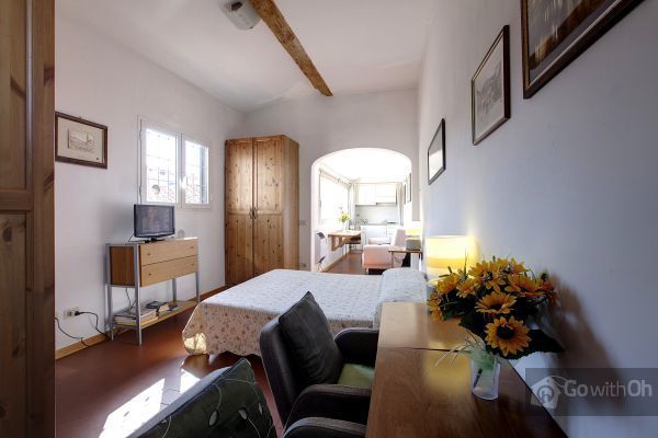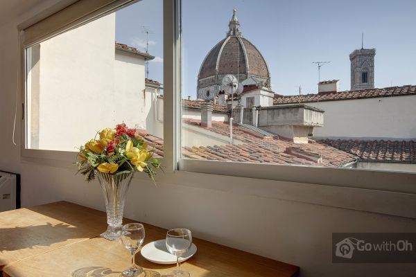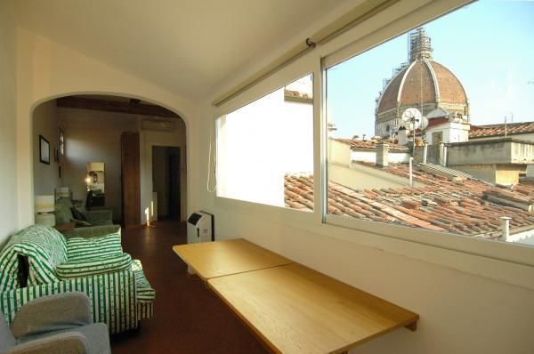 Studio-appartement met groot raam en fantastisch uitzicht over de daken van Florence, de koepel van de Duomo en de Klokkentoren van Giotto. 30 vierkante meter op de vierde verdieping zonder lift. Maximaal drie slaapplaatsen verdeeld over een tweepersoonsbed en een eenpersoonsslaapbank, kookhoek, badkamer met douche.