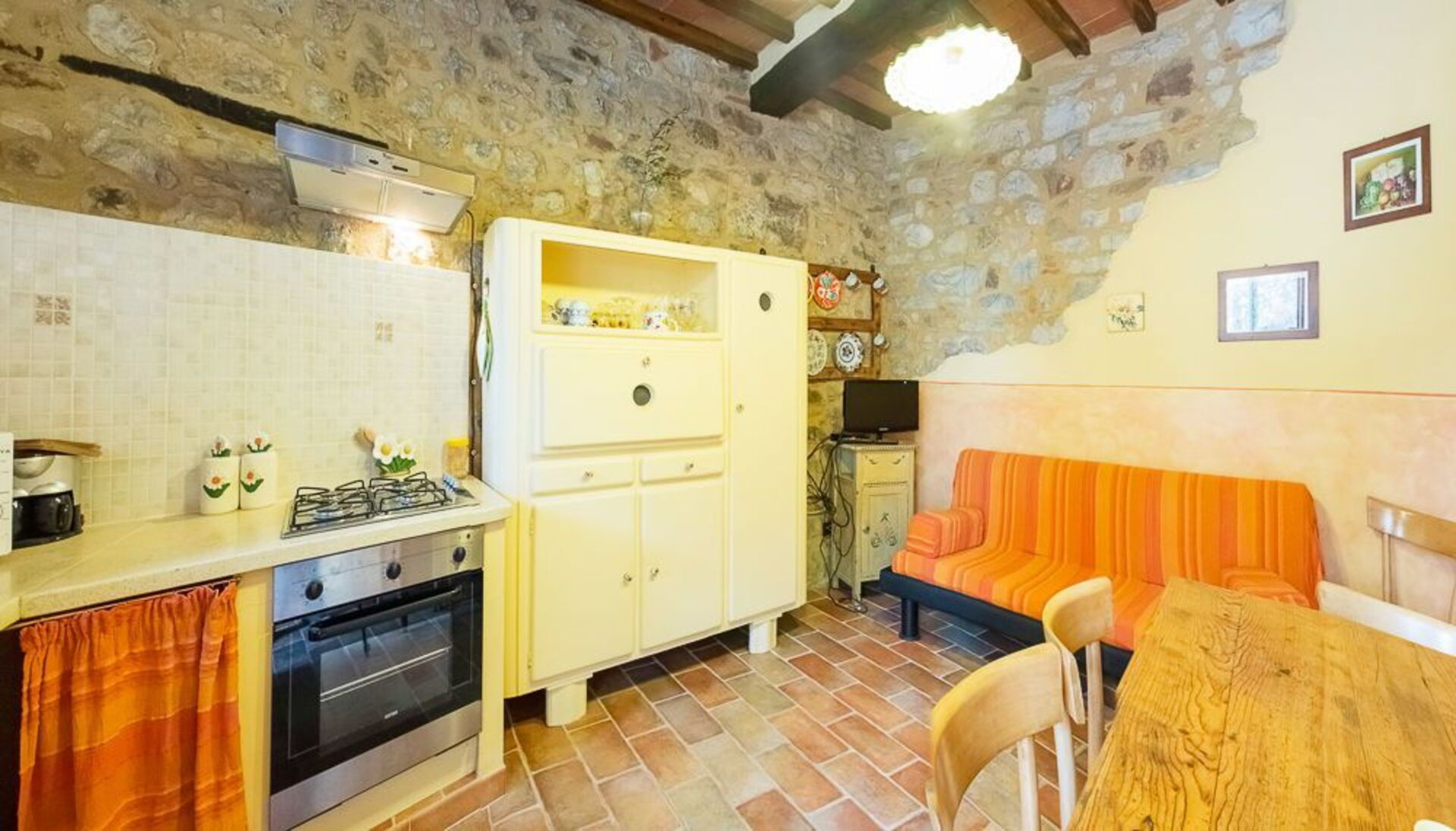 The house, cozy and welcoming, has been recently restored. It also offers a tiny terrace furnished with table and chairs perfect to enjoy an al-fresco meal overlooking Duddova’s alleys. Around 100m from the property, the owner has created a private area, reserved to the exclusive use of the guests staying in La Ruota, provided with garden furniture and a pleasant private swimming pool (above ground).