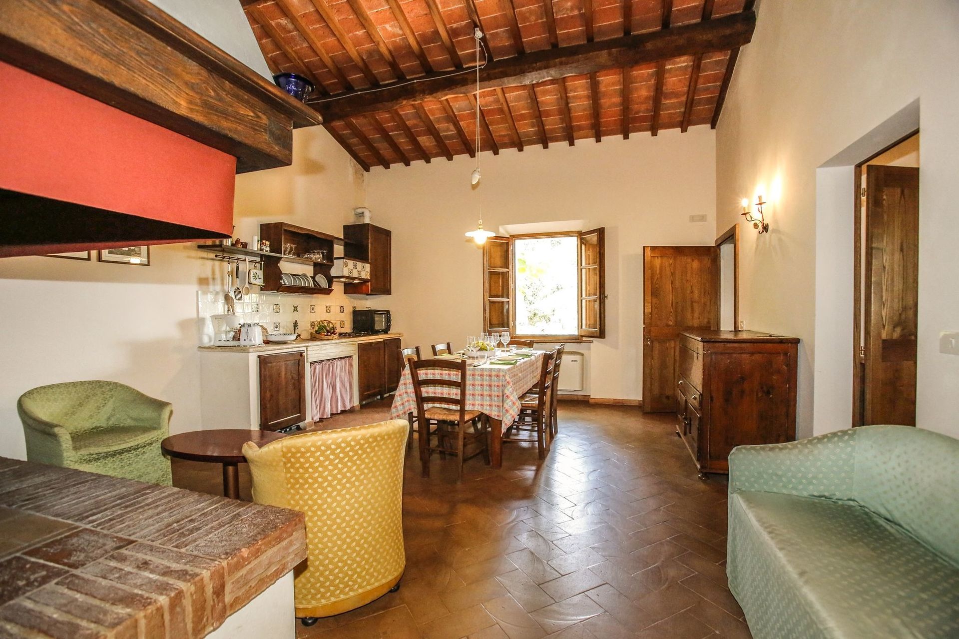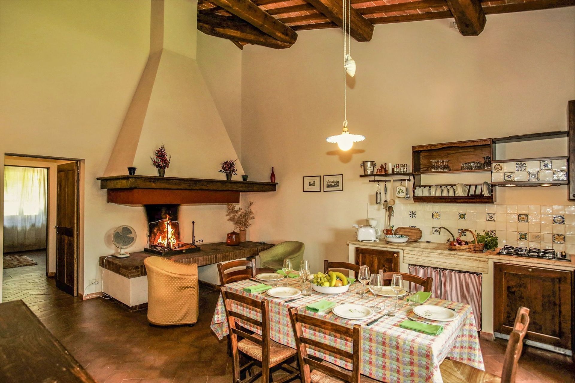 Keuken – woonkamer: goed uitgeruste keuken, eettafel (personen: 6), vaatwasser, ijskast, kookplaat, oven, broodrooster, italiaans koffiezetapparaat, koffiezetapparaat, bank, fauteuil, open haard, WIFI internet, satelliet tv.