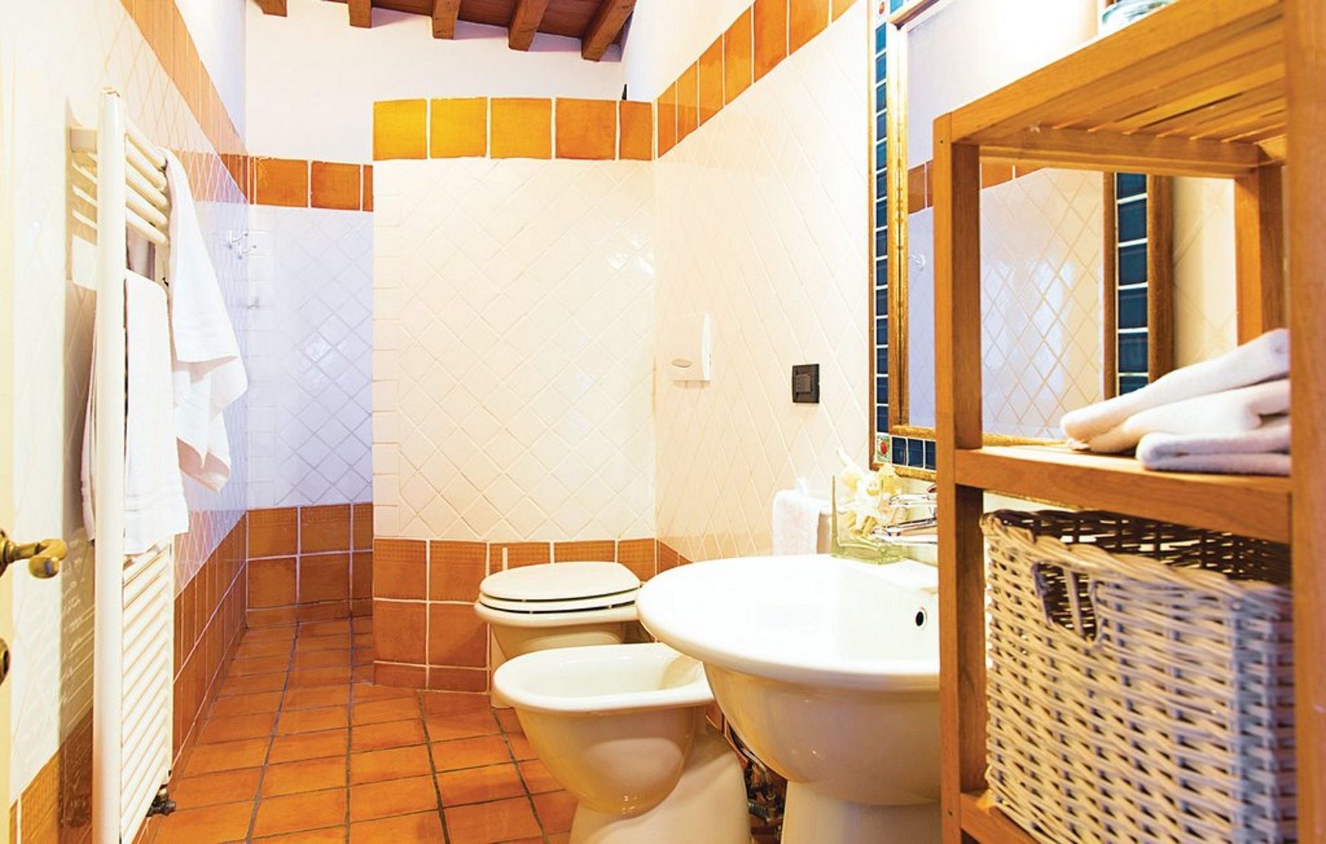 Badkamer: wastafel, toilet , bidet, douche, airconditioning.