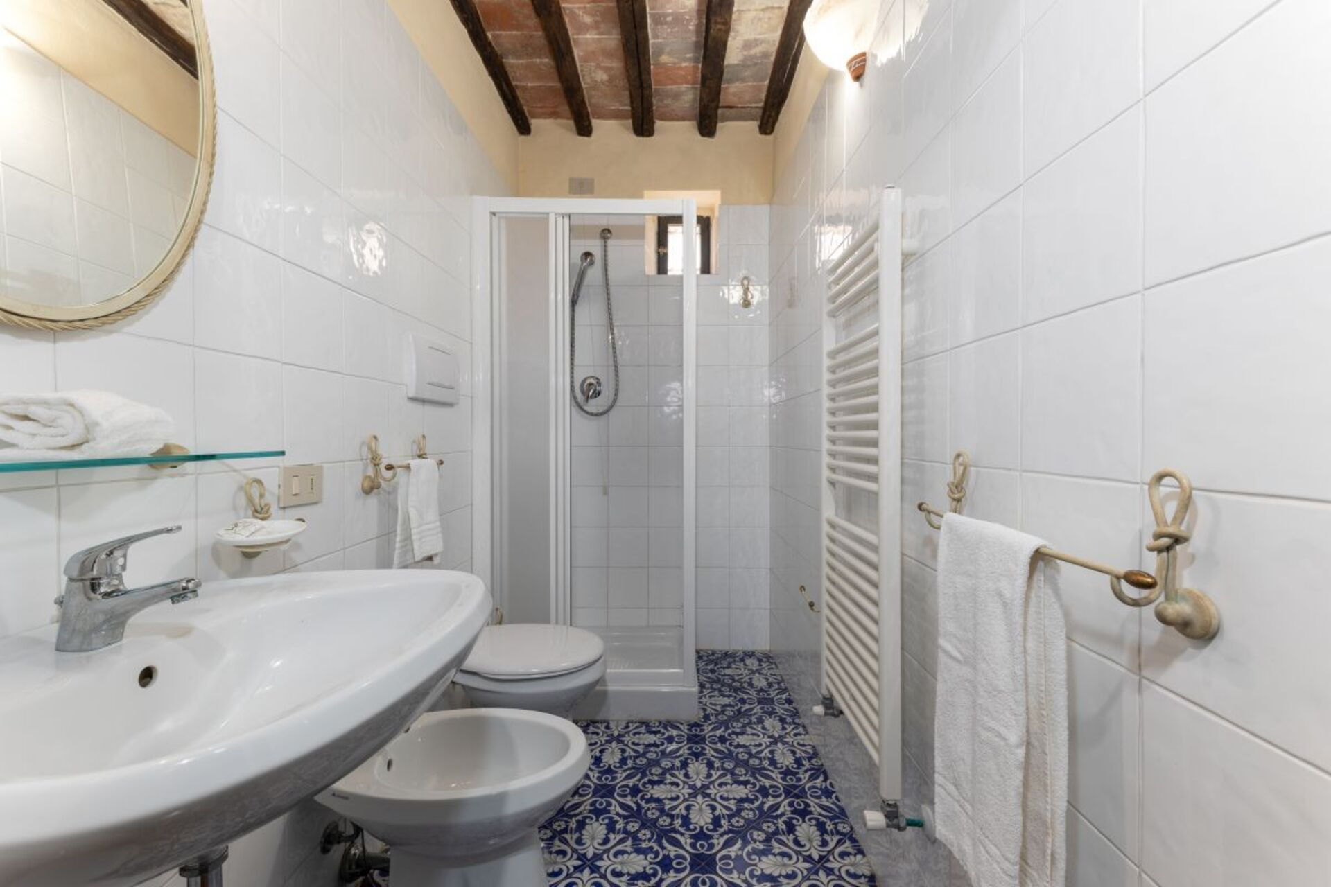 Badkamer: wastafel, toilet , bidet, douche.