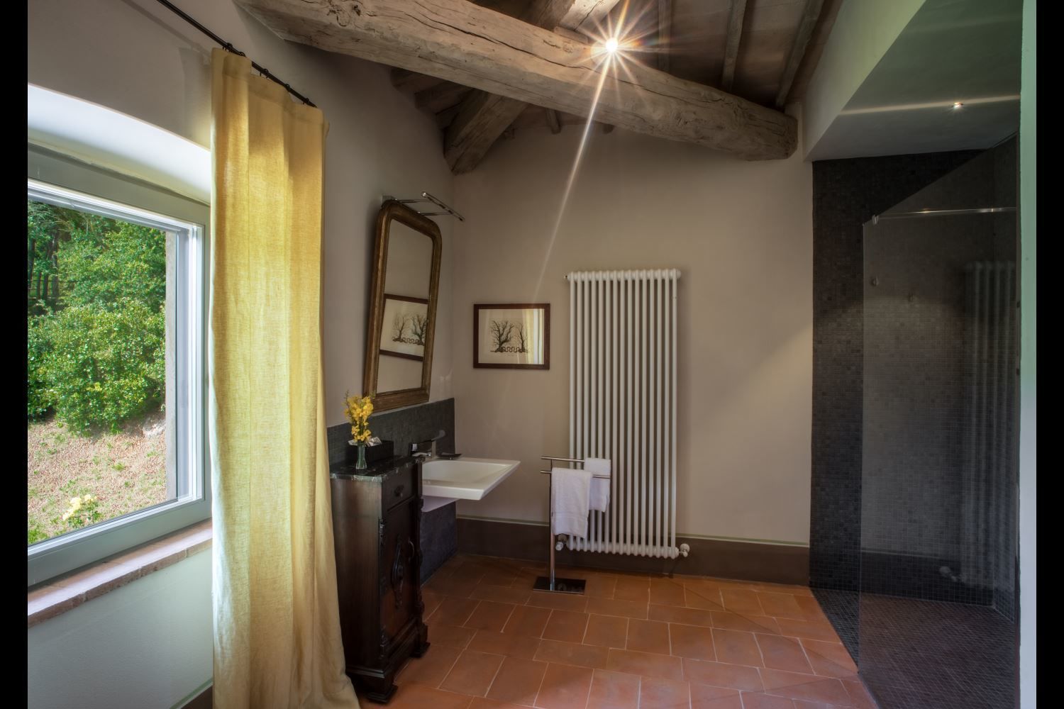 FIRST FLOOR: with entrance through external, covered staircase which has access from the porch, or through wooden bridge on the rear of the villa, sitting room and sofas, Satellite Tv and typical wood burning oven in the panoramic loggia. Wide living-dining room with ancient fireplace and kitchen. Two double bedrooms both with private bathroom with shower, one double bedroom with private bathroom with shower suitable for disabled.