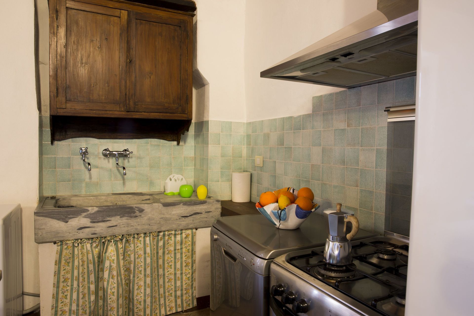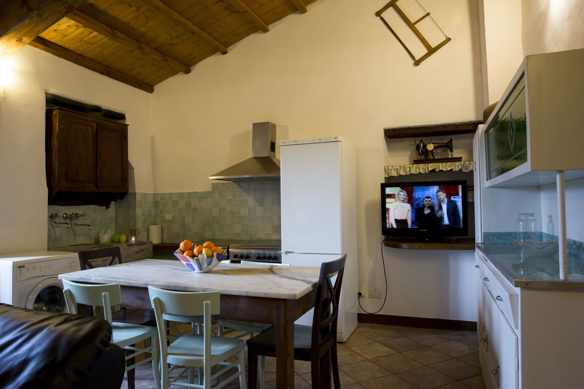 Keuken – woonkamer (30 m2): goed uitgeruste keuken, eettafel (personen: 8), vaatwasser, ijskast, diepvriezer, kookplaat, oven, italiaans koffiezetapparaat, wasmachine, twee fauteuils, open haard, WIFI internet, internet, hor, tv, uitgang naar het balkon, uitgang naar het terras, uitgang naar de veranda.