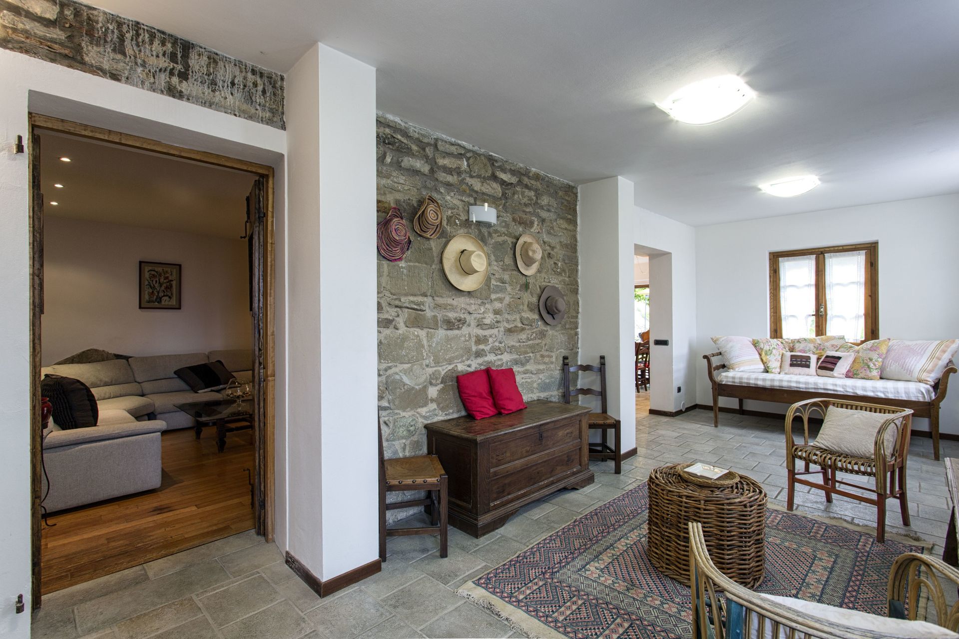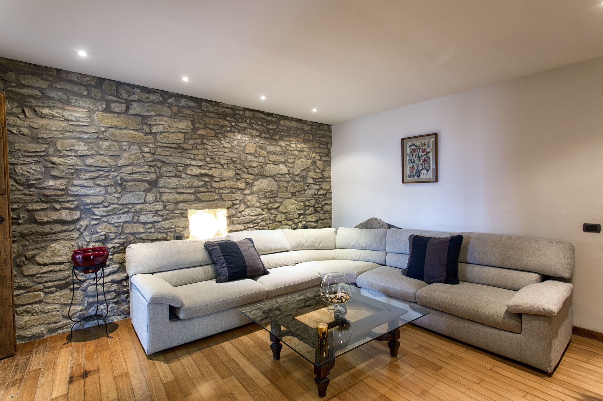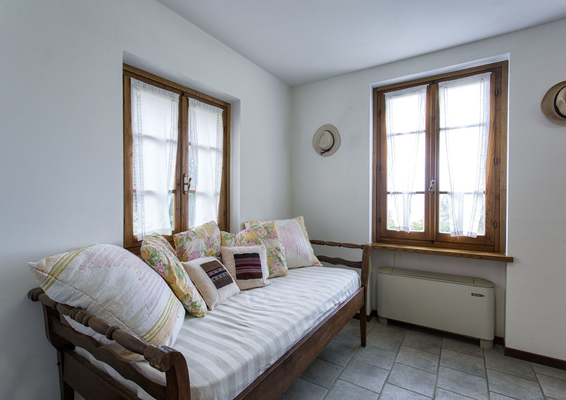 Woonkamer: bank (personen: 4), open haard, tweepersoons-slaapbank, airconditioning, uitgang naar het terras.