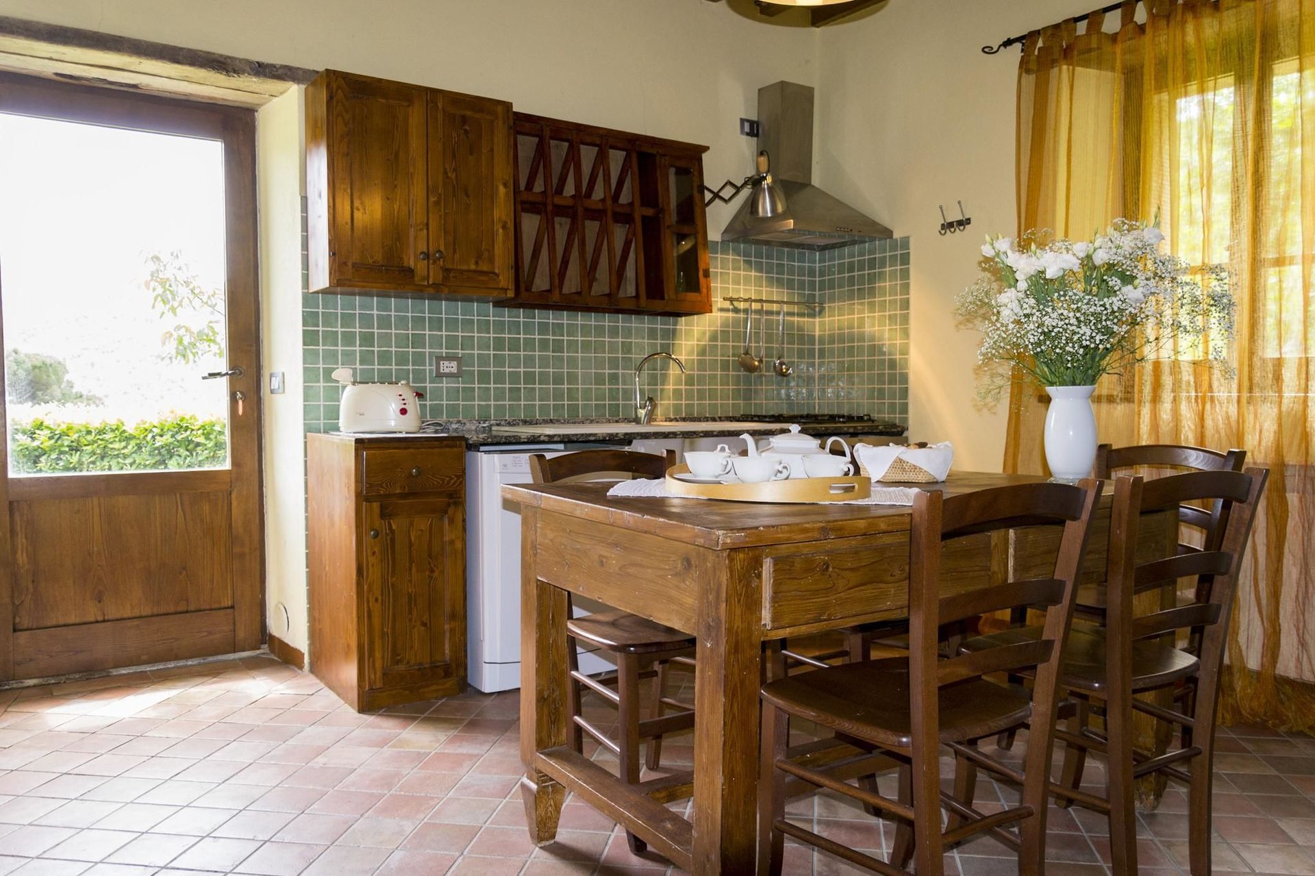 Keuken: goed uitgeruste keuken, eettafel (personen: 6), vaatwasser, ijskast, diepvriezer, magnetron, kookplaat, oven, broodrooster, koffiezetapparaat, uitgang naar de tuin.