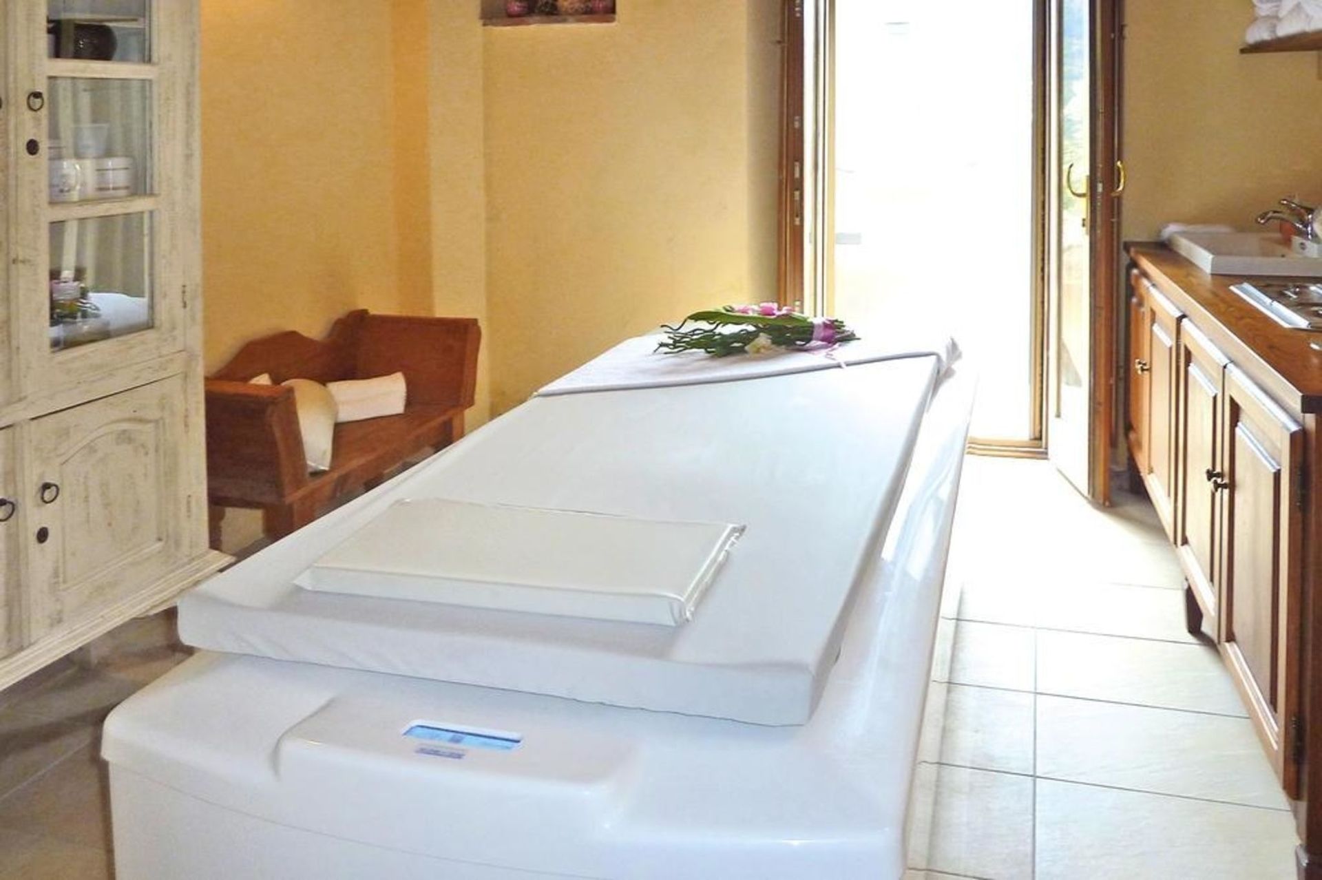 Badkamer: bubbelbad, wastafel, toilet , bidet, douche.