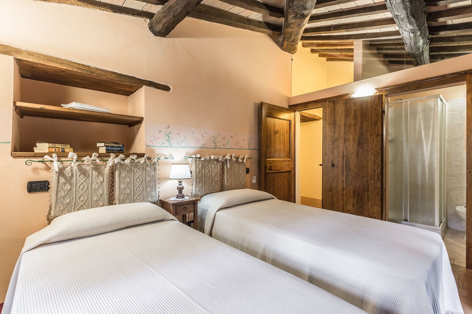 Slaapkamer met badkamer 4: twee eenpersoonsbedden, WIFI internet, airconditioning, hor, wastafel, toilet , bidet, douche, haardroger.