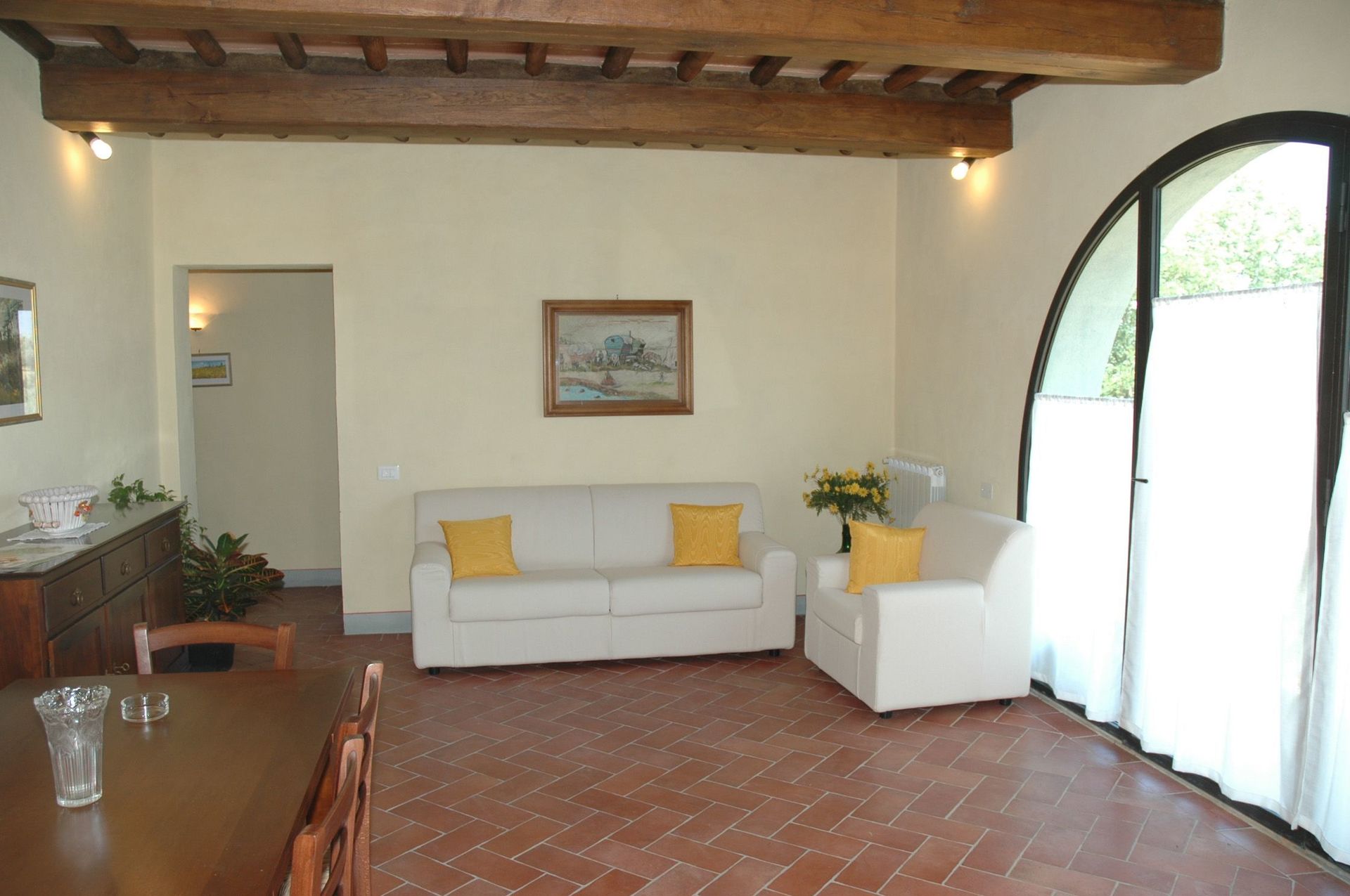 Peaceful rural location on Chianti wine route surrounded by olive groves and vineyards. Easy drive to Florence, Sienna or San Gimignano, etc. Friendly owners with wonderful olive oil and cheese produced on the property. Excellent restaurants within a few minutes drive. Downside with the high temperatures (late June) was the lack of fan or air con & the number of flies which made the stay less enjoyable - fly screens for the doors would help - and although a pool was advertised with the property it was out of commission the week we were there.
