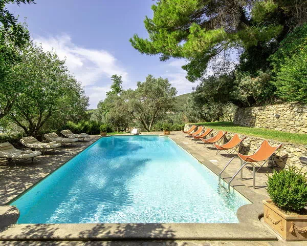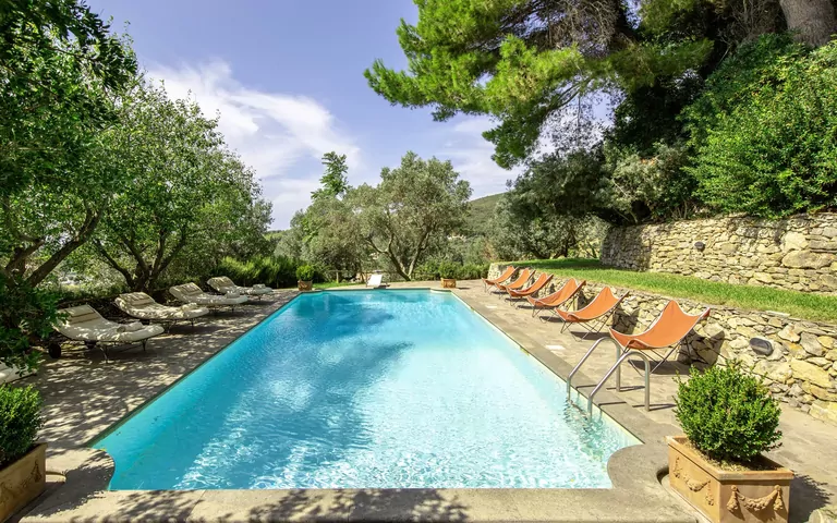 Ter beschikking van de gasten: grote terrasvormige tuin, zeer verzorgd, zwembad (5 x 11 m – max. diepte 3 m) omheind en met kleedhok en toilet, kleine Jacuzzi, overdekt terras waar men buiten kan eten.