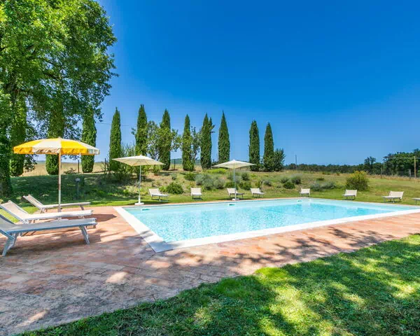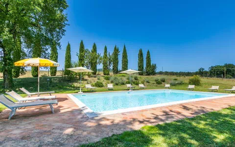 De buitenruimten van "Podere S Giovanni" behoren werkelijk tot de meest opmerkelijke kenmerken van het pand, ontworpen om optimaal gebruik te maken van de spectaculaire ligging op de heuvel en de natuurlijke schoonheid van het omringende platteland. Het privézwembad, met afmetingen van 6 x 12 m en een diepte variërend van 30 tot 145 cm, is uitgerust met een interne trap en een zoutelektrolyse-zwembadschoonmaaksysteem, wat een schoon en comfortabel zwemervaring gedurende uw verblijf garandeert. Een speciaal buitendouche is gemakkelijk bereikbaar voor het afspoelen na het zwemmen. Het ingerichte terras biedt een ideale plek voor eten en socializen in de open lucht, met tuinmeubels doordacht gerangschikt om volledig gebruik te maken van het panoramische uitzicht. Een barbecue is ook beschikbaar, wat buitendineertjes een waar genoegen maakt tijdens warme zomeravonden. Het privépark van 3.000 m2 omringt het pand met aangelegde gronden, wat een rustige groene ruimte biedt waar u kunt wandelen, ontspannen en jezelf onderdompelen in de authentieke sfeer van de Toscaanse heuvels. Een zonneterras breidt de buitenleefruimten verder uit en biedt een perfecte plek om van de zon en het uitgestrekte uitzicht op het golvende landschap te genieten.