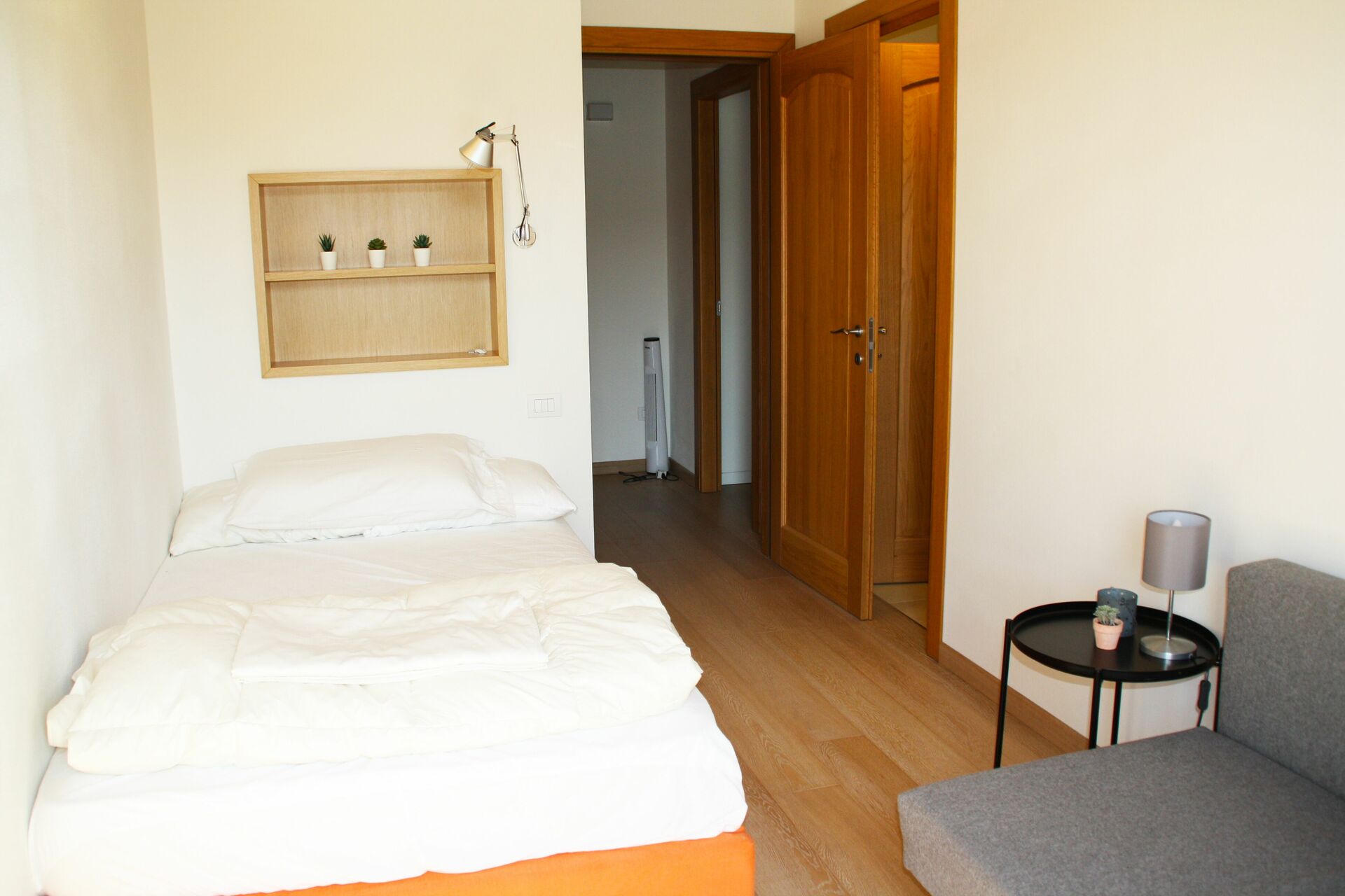Slaapkamer met badkamer 1: smal tweepersoonsbed (breedte: 1.2m), slaapbank, wastafel, toilet , douche.