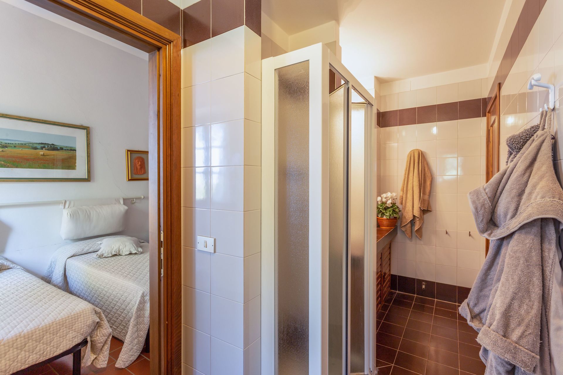 Houd er rekening mee dat de badkamer op de 1e verdieping 2 deuren heeft: deze is toegankelijk vanuit beide slaapkamers op dezelfde verdieping.