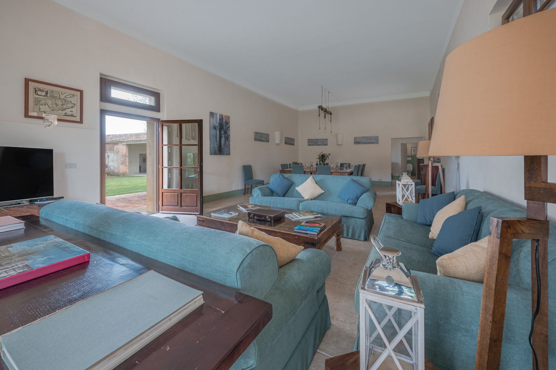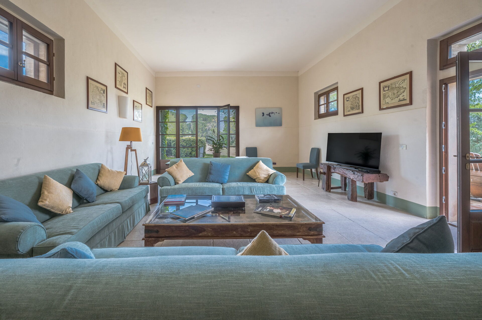 Woonkamer: drie banken, eettafel (personen: 20), WIFI internet, tv, dvd/videospeler, stereo , uitgang naar de tuin.