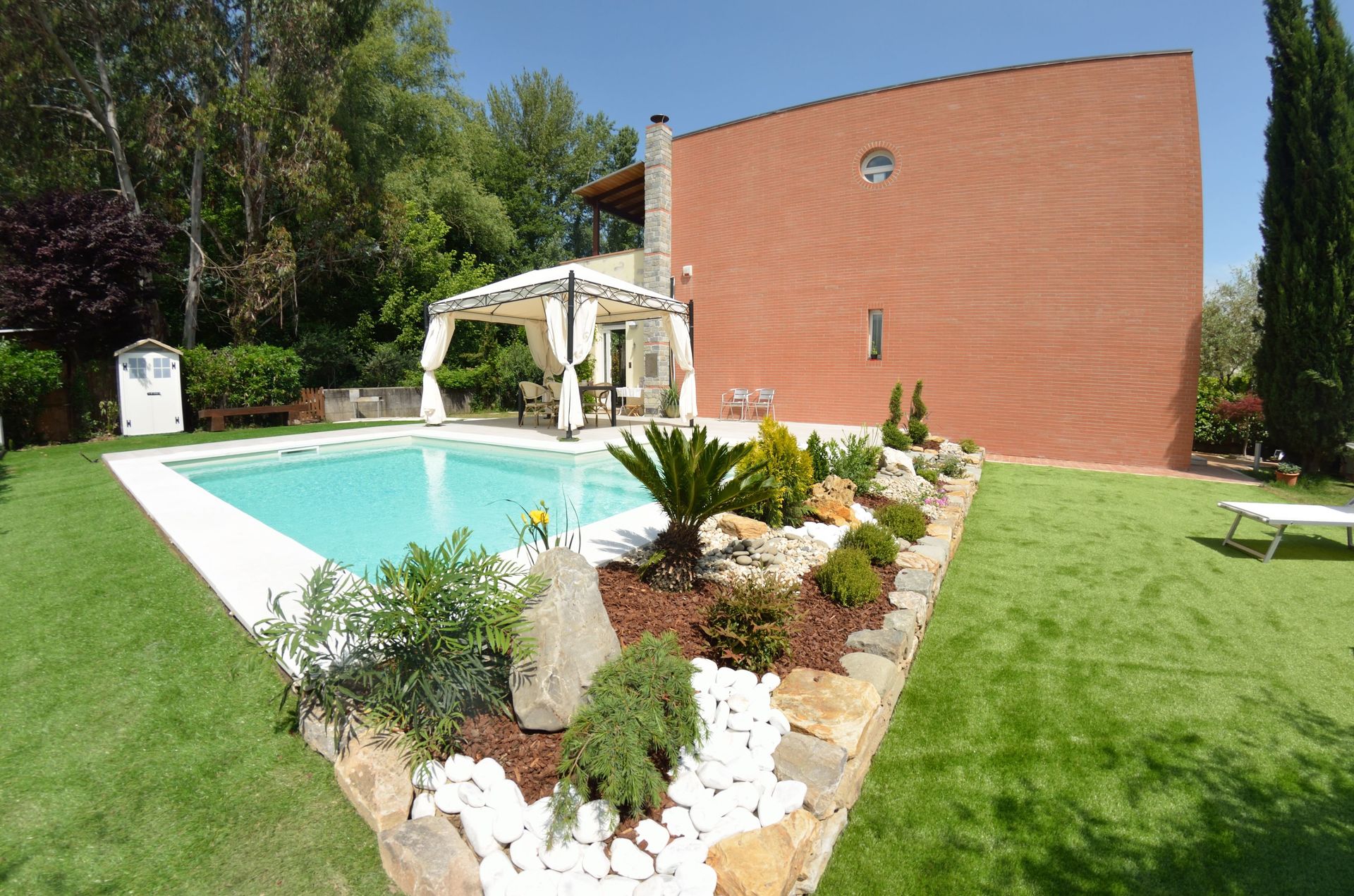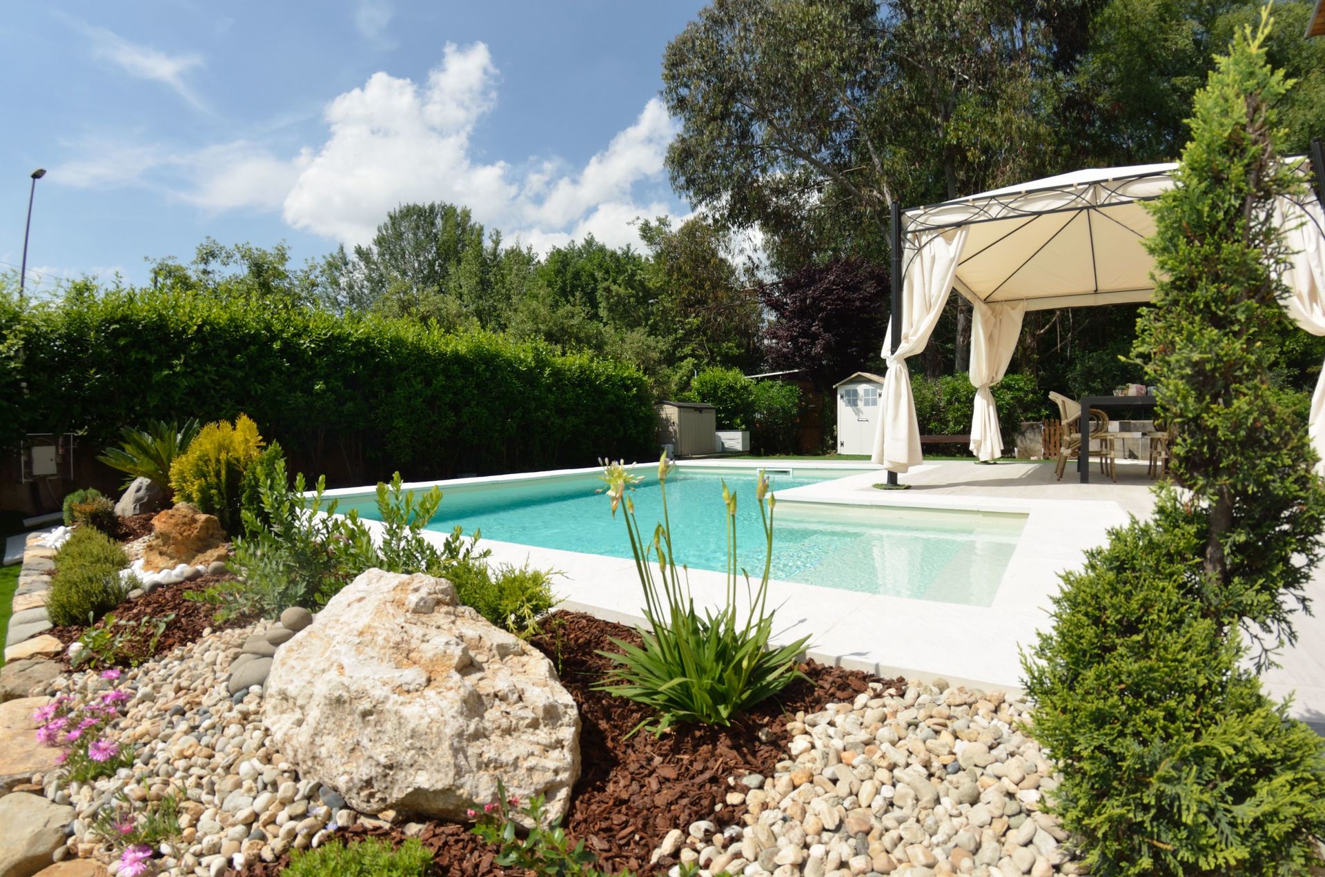 Tuin: zwembad (breedte: 3m, lengte: 6m, diepte: 1.4m), barbecue, dineren in de buitenlucht, eettafel (personen: 6), gazebo, tuinmeubilair, twee ligstoelen, omheind grondstuk.