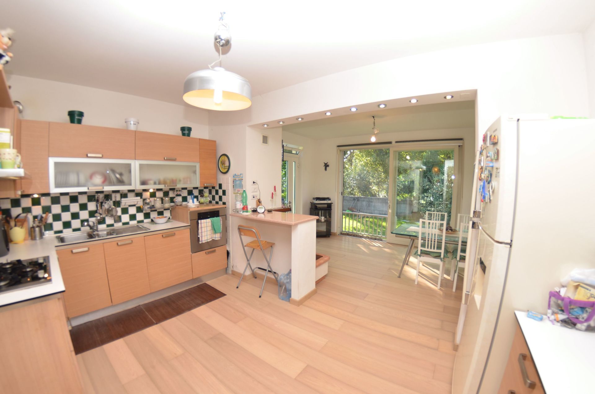 Keuken: eettafel, vaatwasser, ijskast, diepvriezer, magnetron, kookplaat, oven, koffiezetapparaat, wasmachine, open haard, uitgang naar de tuin.