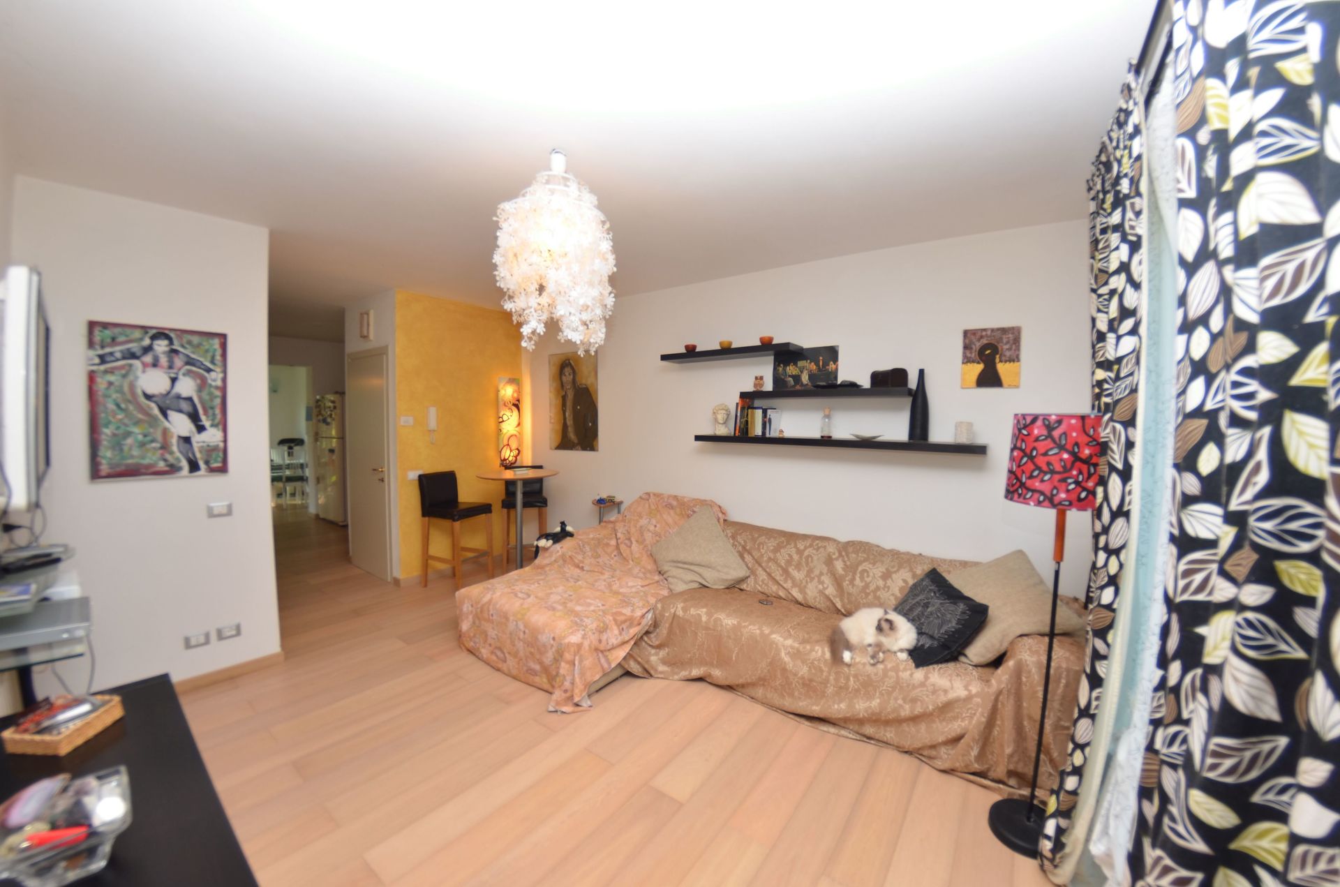 Woonkamer: tweepersoons-slaapbank, tv, uitgang naar de tuin.