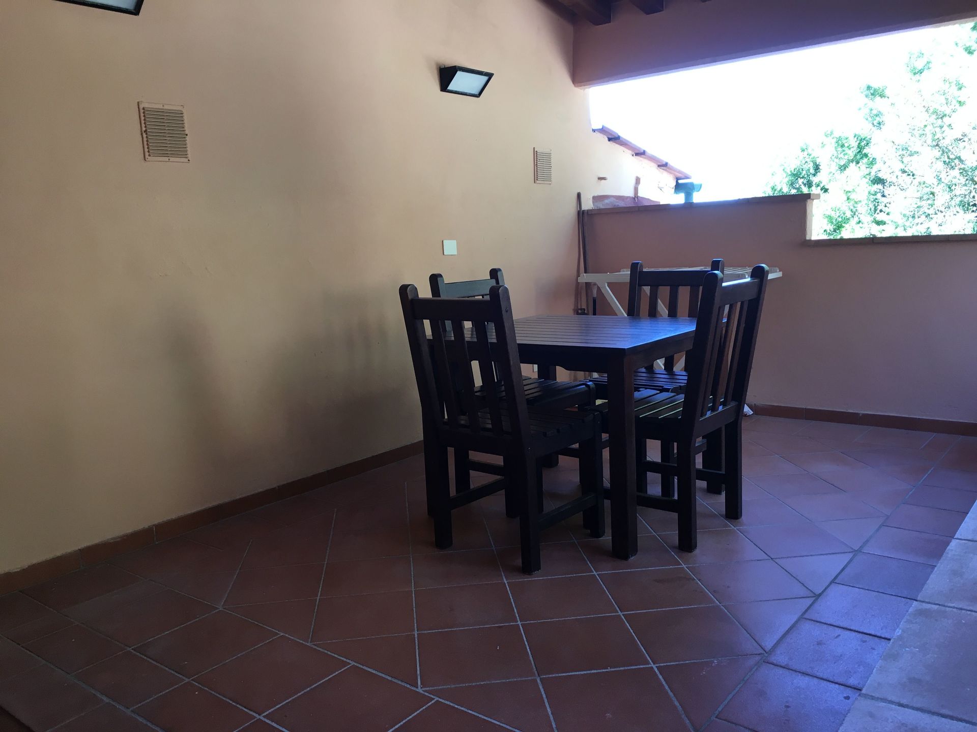Keuken – woonkamer: eettafel (personen: 4), ijskast, kookplaat, oven, italiaans koffiezetapparaat, tweepersoons-slaapbank, airconditioning, tv.