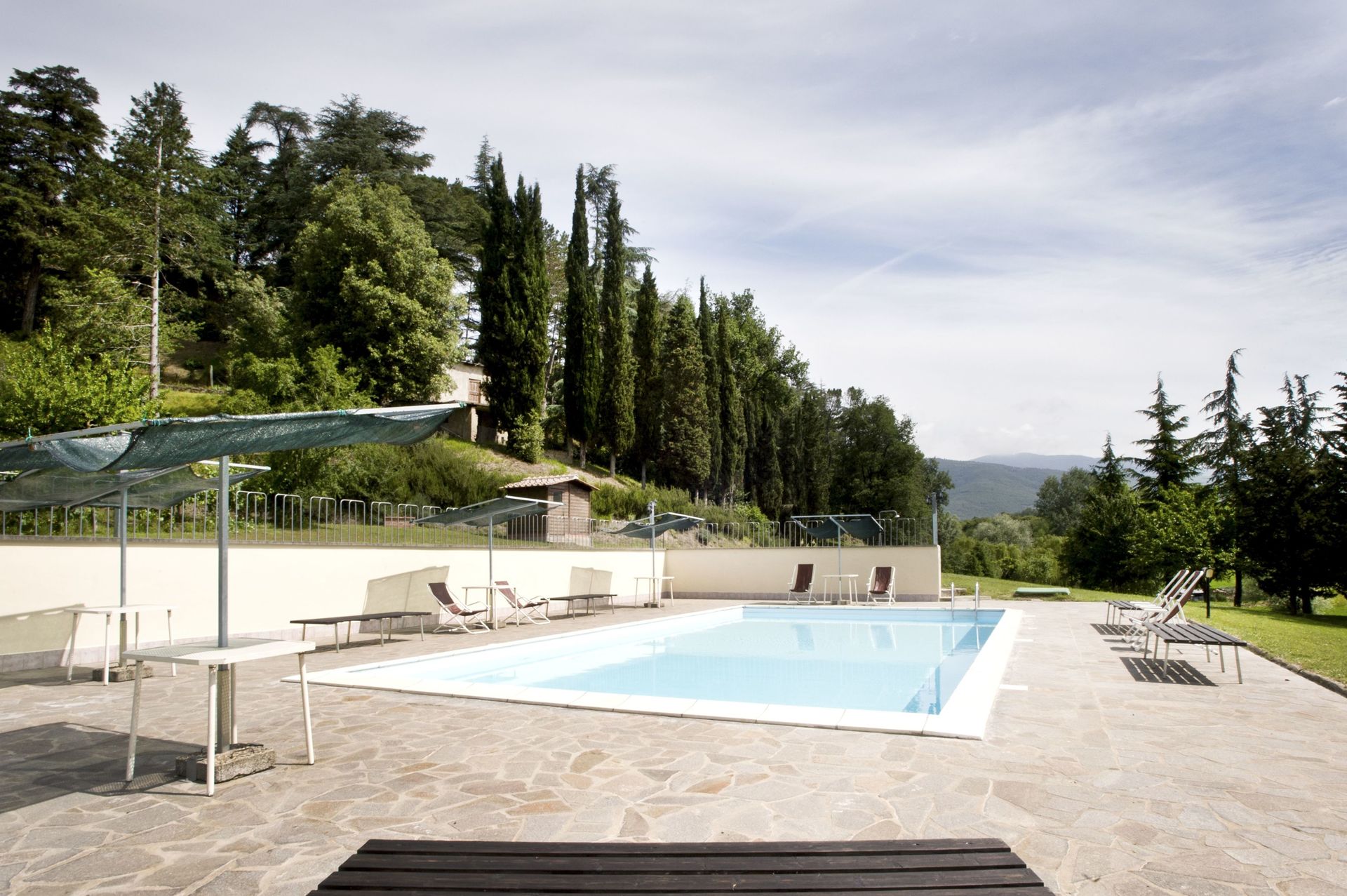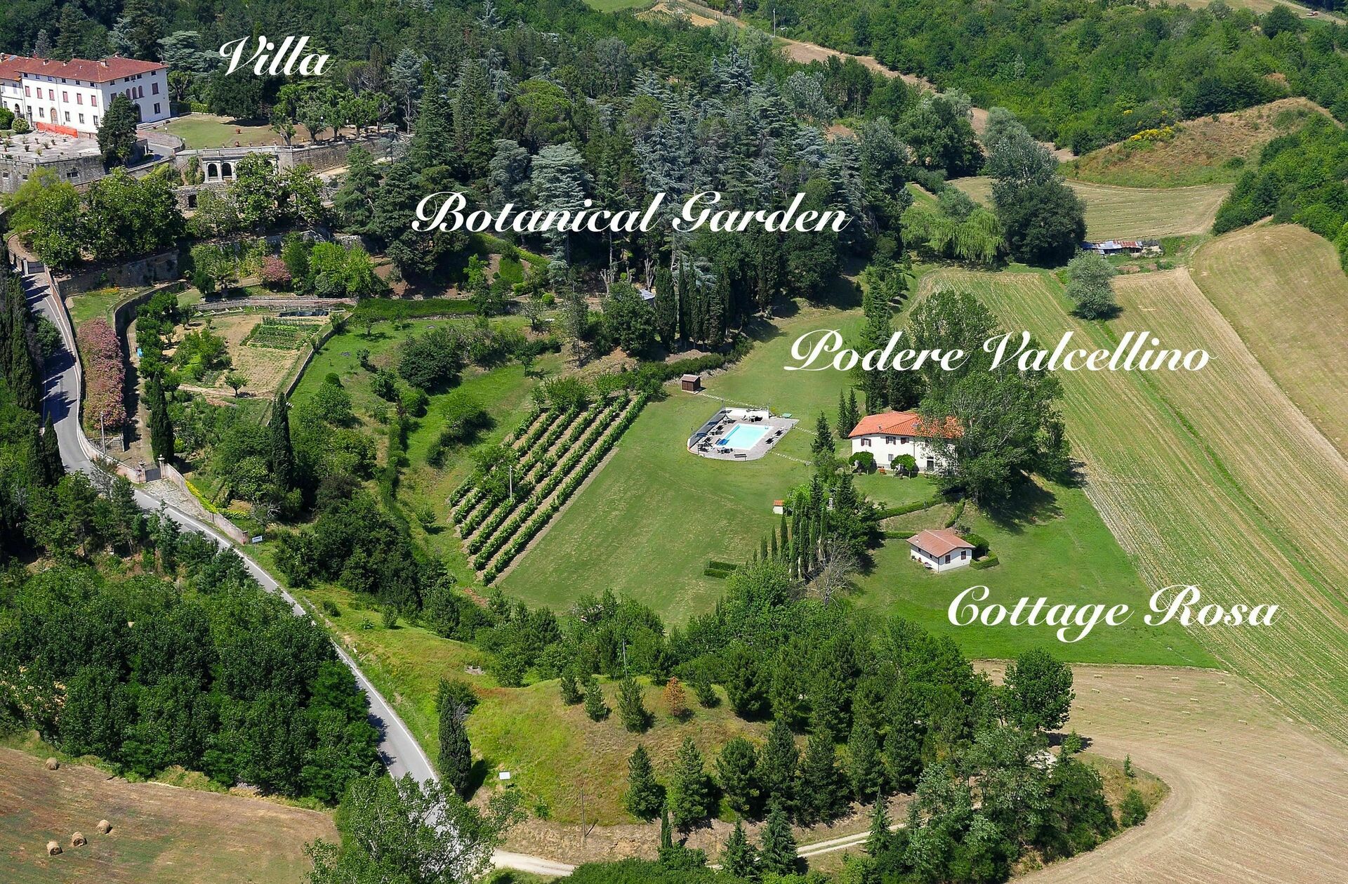 Outside this residence a breathtaking view on the Tuscan hills overlooks the whole park and property. A large and green corridor descends down through the botanical park to the farmhouse and pool area. No need to say that you'll be captured by the beauty of this path: hidden sitting areas are dislocated into the park, and multiple stairways climb the hill until the top. Flowers, trees and birds singing will be accompanying you till the bottom of the hill, you will feel else where, you will not believe to be in such a beautiful place!