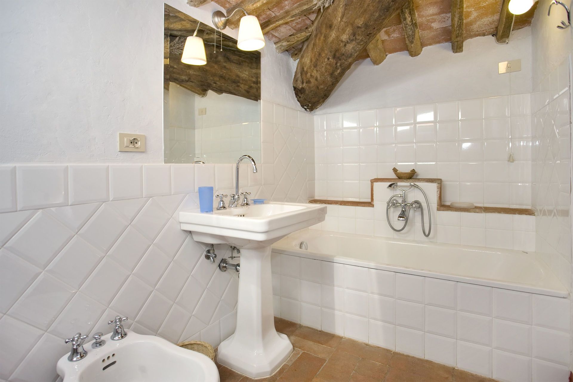 Badkamer: wastafel, toilet , bidet, douche.