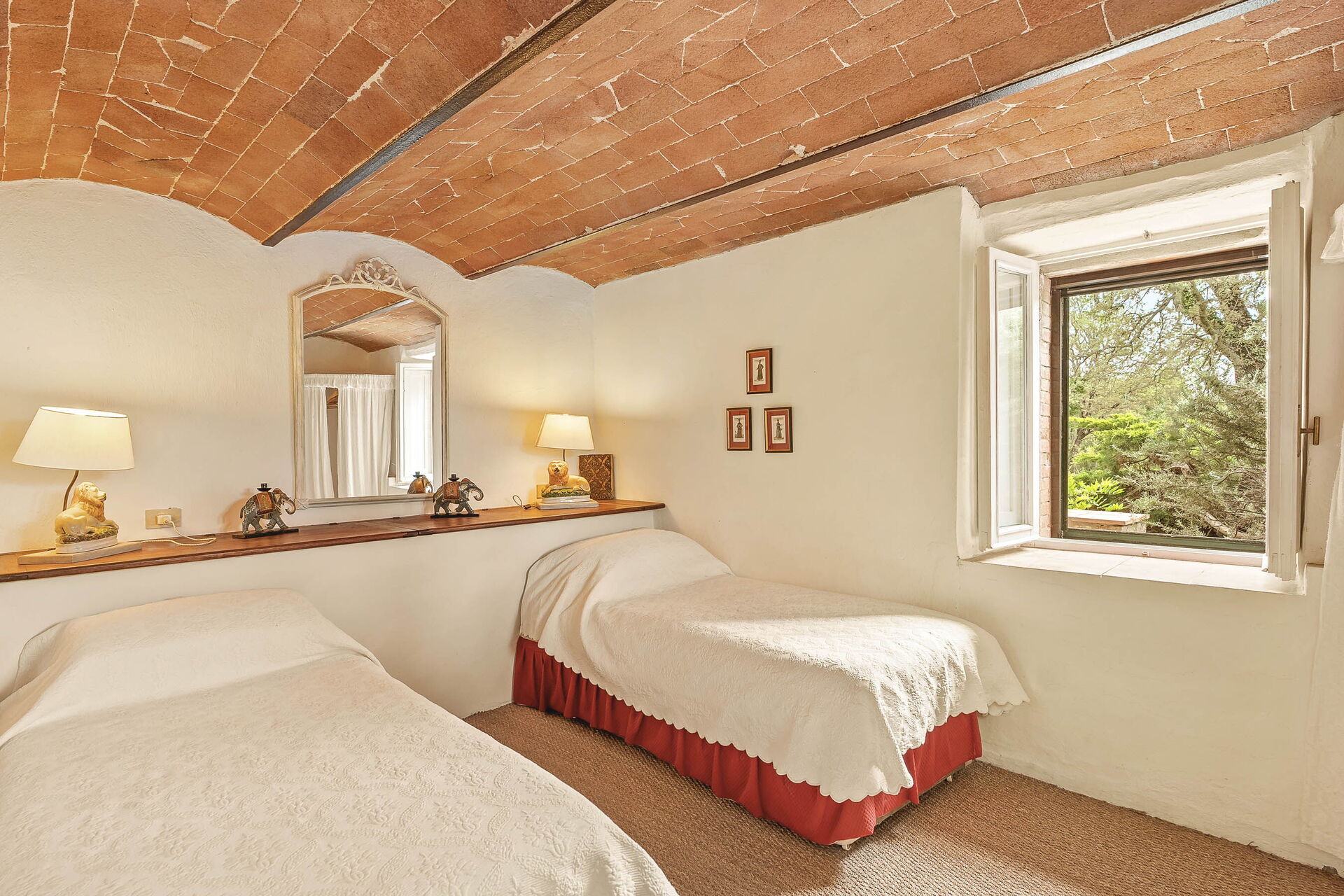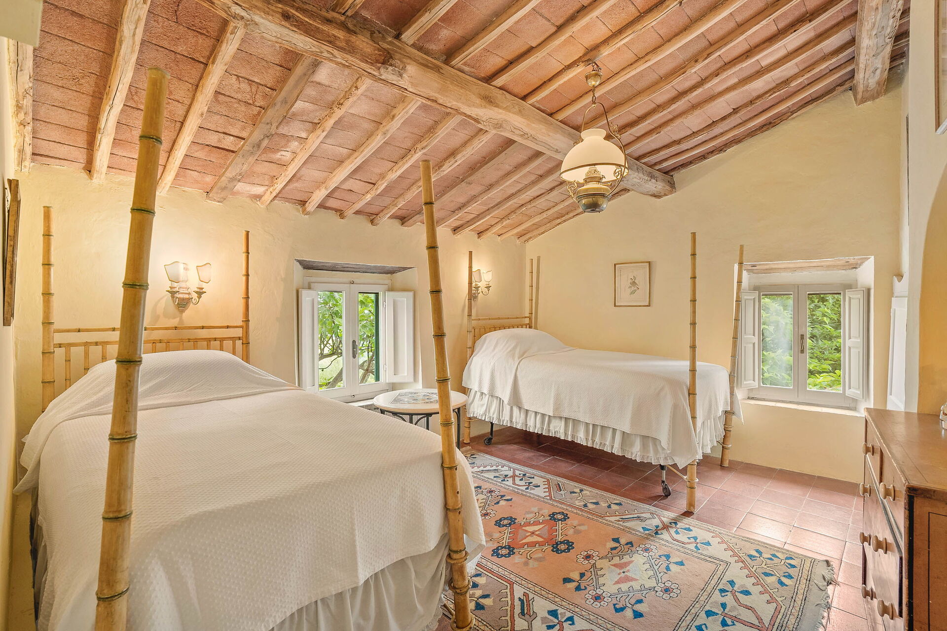 Slaapkamer 4: smal tweepersoonsbed (breedte: 1.35m, lengte: 2.1m), WIFI internet, hor, ventilator, uitgang naar de tuin.