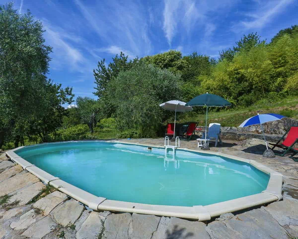 Het niervormige zwembad meet 8 x 5 meter en is beschikbaar van 1 mei tot 30 september. Naast het zwembad bevindt zich een volledig uitgerust poolhuis met een koelkast en een kooktoestel. Een pergola biedt schaduw voor ontspanning op warme Toscaanse middagen, terwijl het terras een ideale plek is voor buitendinen en gezelligheid. Tuinmeubilair is beschikbaar in alle buitenruimtes; een barbecue staat ter beschikking voor maaltijden in de open lucht. Het omliggende natuurlijke landgoed van 7 hectare met bomen, weiden en een boomgaard creëert een groene en privé achtergrond.
