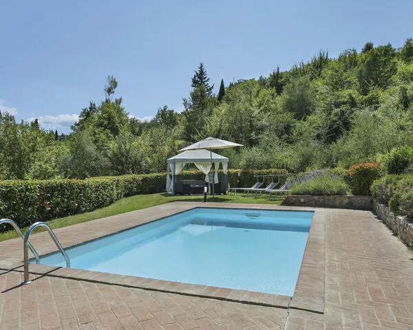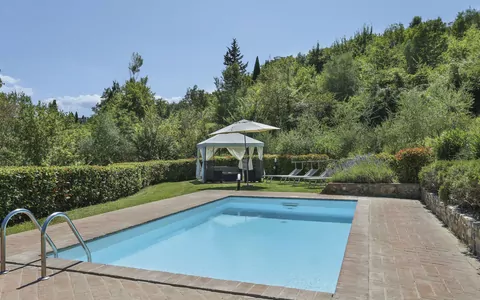 Het privéperceel van 2.000 vierkante meter herbergt een terrastuin die, hoewel niet omheind, de schoonheid van het Toscaanse landschap omarmt met een wildtuin en een open weiland. Het zwembad meet 8 bij 4 meter met een diepte van 100 tot 160 centimeter en is beschikbaar van 1 mei tot 30 oktober. Bij het zwembad bevinden zich een buitendouche, een charmante pergola en tuinmeubilair, wat een uitnodigende omgeving schept voor buitendinen, ontspanning en genieten onder de open hemel.