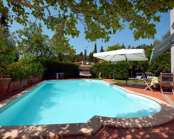 Villa Lucia is een ruim tweegezinshuis gelegen in een rustige woonwijk omgeven door elegante villa's, op 3 km van het centrum van Prato in het hart van Toscane. Het pand strekt zich uit over 2 verdiepingen en combineert comfort met privacy. De villa ligt binnen een volledig omheind terrein met een fraai aangelegde terrastuin vol volwassen bomen en een goed onderhouden gazon.