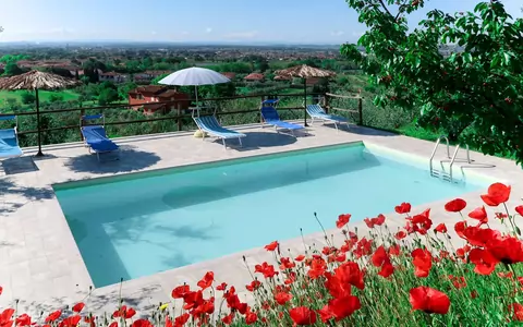 De buitenruimtes van Agrumi zijn uitzonderlijk, met een uitgebreide terrashof van 3.000 m² die schilderachtig is ingericht met een goed onderhouden gazon, volwassen bomen en een charmante boomgaard. Een speciaal grasveld biedt de perfecte plek voor zonnebaden. Het zwembad meet 8 x 4 meter met een diepte van 120 cm en is beschikbaar van 4 april tot 24 oktober. Een buitendouche bevindt zich in de buurt van het zwembad. Een goed uitgerust terras met tuinmeubilair biedt een ideale plek voor buitendinen en het genieten van het panoramische uitzicht op het omringende platteland. Een barbecue is aanwezig voor gasten die graag in de open lucht koken.