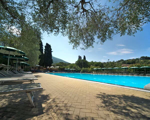 Het zwembad meet 25 x 12 meter en is beschikbaar van mei tot september; een apart kinderzwembad is aanwezig voor gezinnen met jonge kinderen. Een buitendouche bevindt zich in de buurt van het zwembadgebied. De speelplaats biedt kinderen een veilige en aangename ruimte voor recreatie. De omliggende terreinen, gelegen in een eeuwenoude olijfgaard, bieden een natuurlijk schaduwrijk en rustig milieu waar gasten kunnen wandelen en ontspannen. De zacht hellende heuvel waarop het resort is gepositioneerd draagt bij aan het schilderachtige karakter van de buitenomgeving.