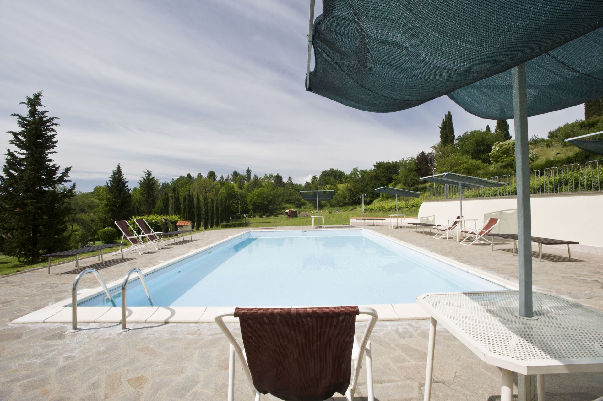 Outside the Podere, a panoramic swimming pool, barbecue area in the garden and views on the Tuscan rolling hills.