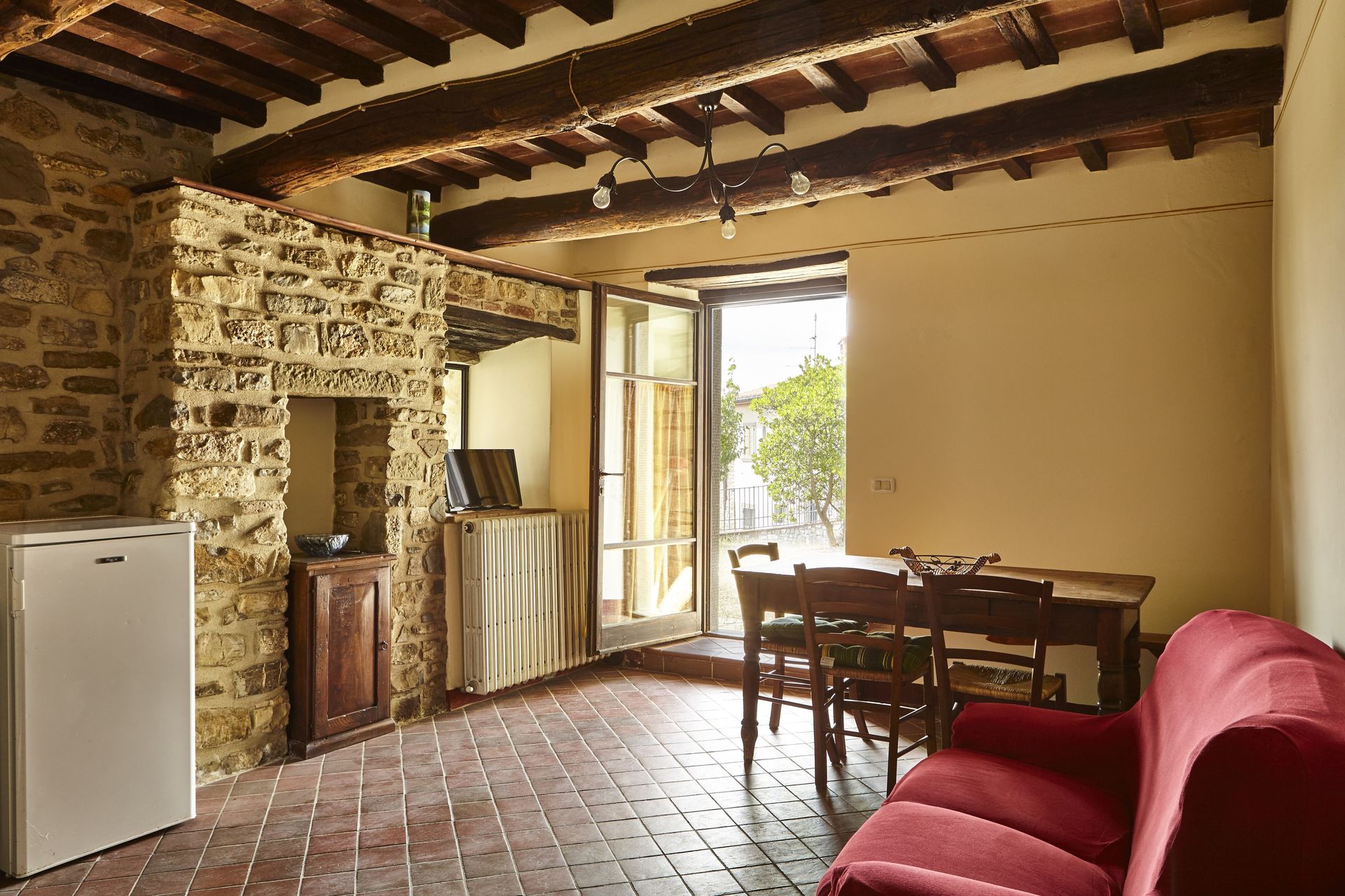 Keuken – woonkamer 1: vaatwasser, ijskast, kookplaat, oven, italiaans koffiezetapparaat, bank, open haard, WIFI internet, uitgang naar de tuin.