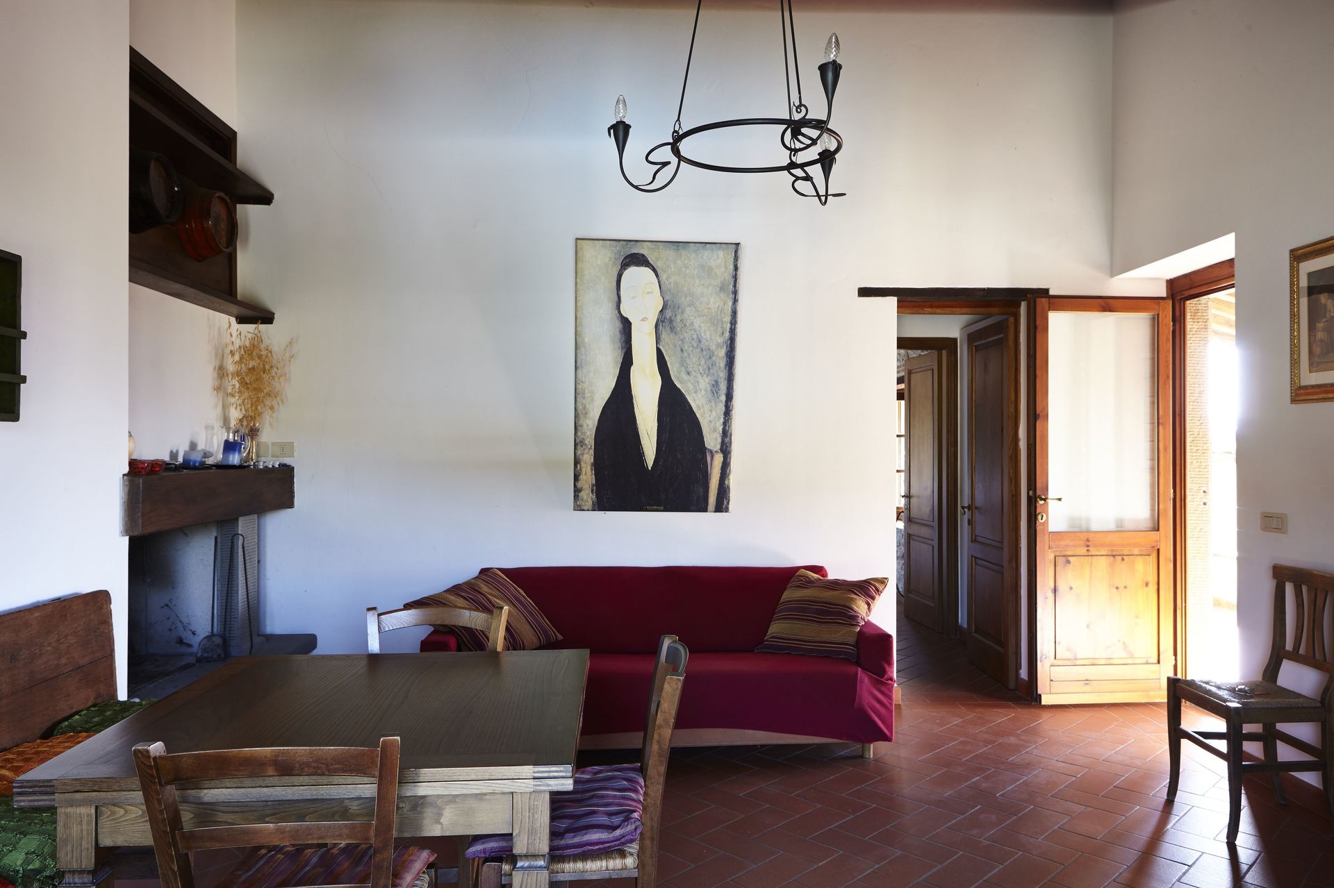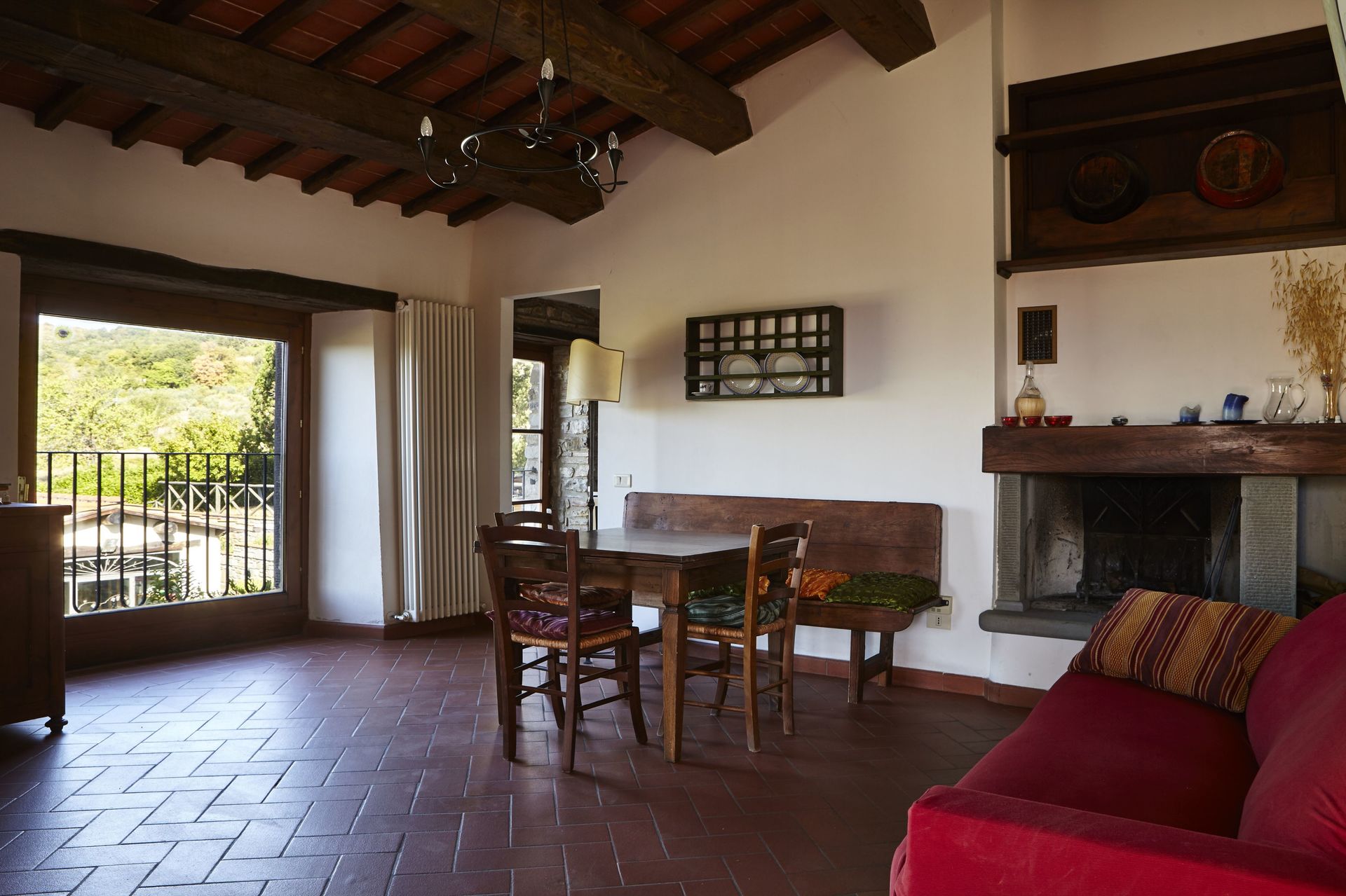 Keuken – woonkamer 3: goed uitgeruste keuken, eettafel (personen: 4), vaatwasser, ijskast, diepvriezer, kookplaat, oven, italiaans koffiezetapparaat, bank, open haard, WIFI internet, satelliet tv, uitgang naar de tuin.
