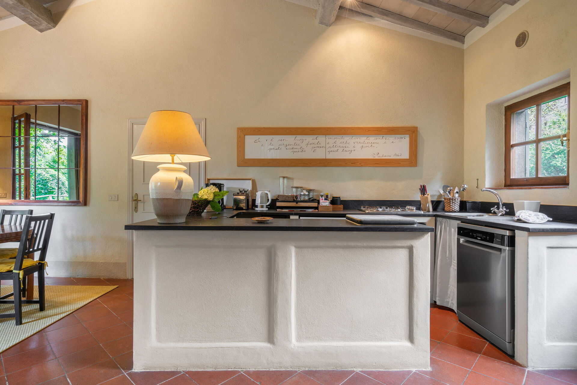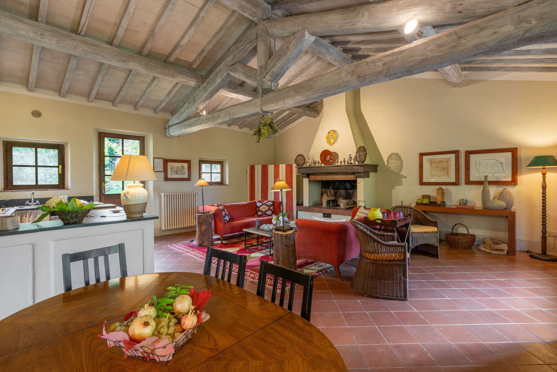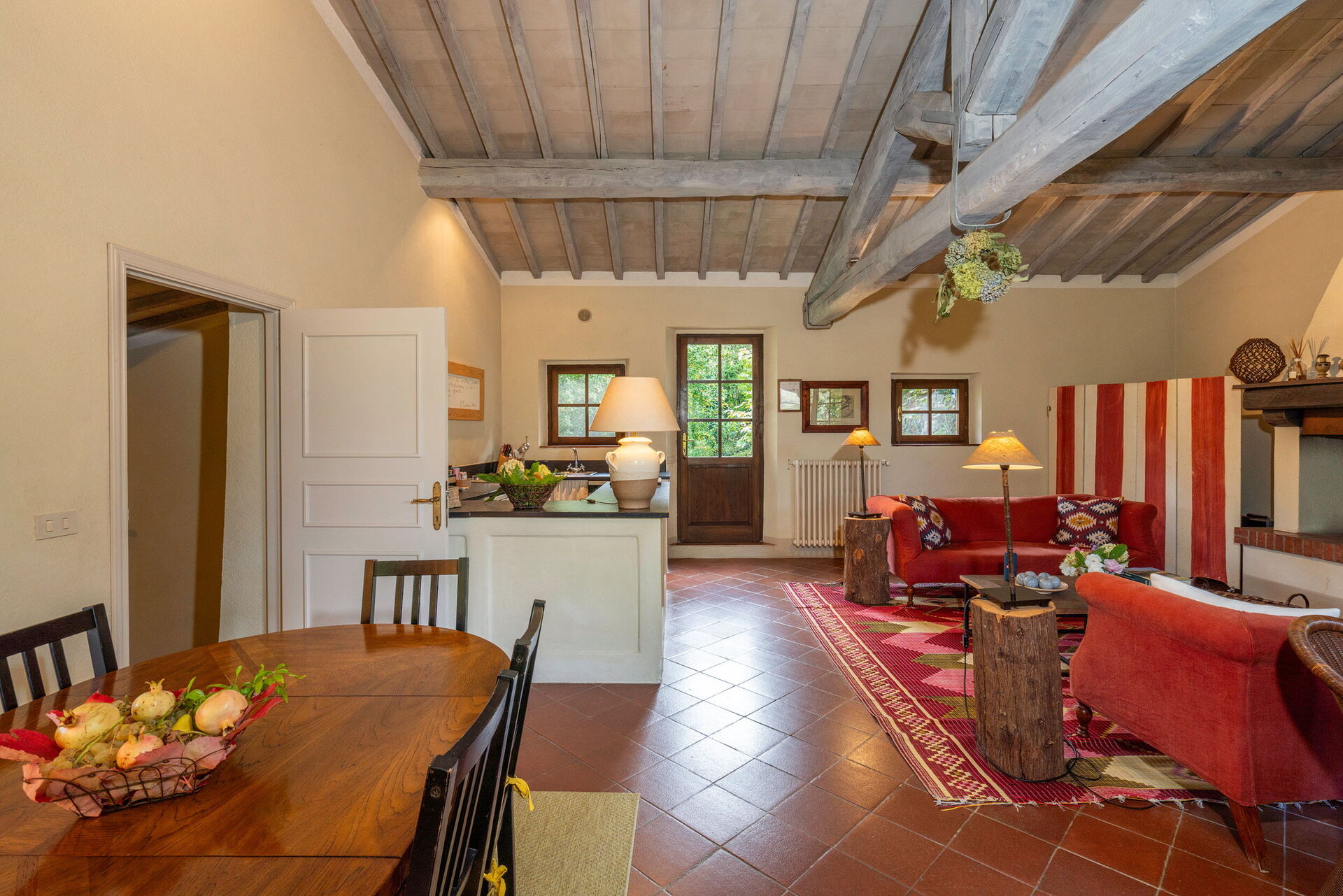 Keuken – woonkamer: goed uitgeruste keuken, eettafel, vaatwasser, ijskast, diepvriezer, magnetron, kookplaat, oven, italiaans koffiezetapparaat, bank, open haard, WIFI internet, satelliet tv, stereo , uitgang naar de tuin, uitgang naar het terras.
